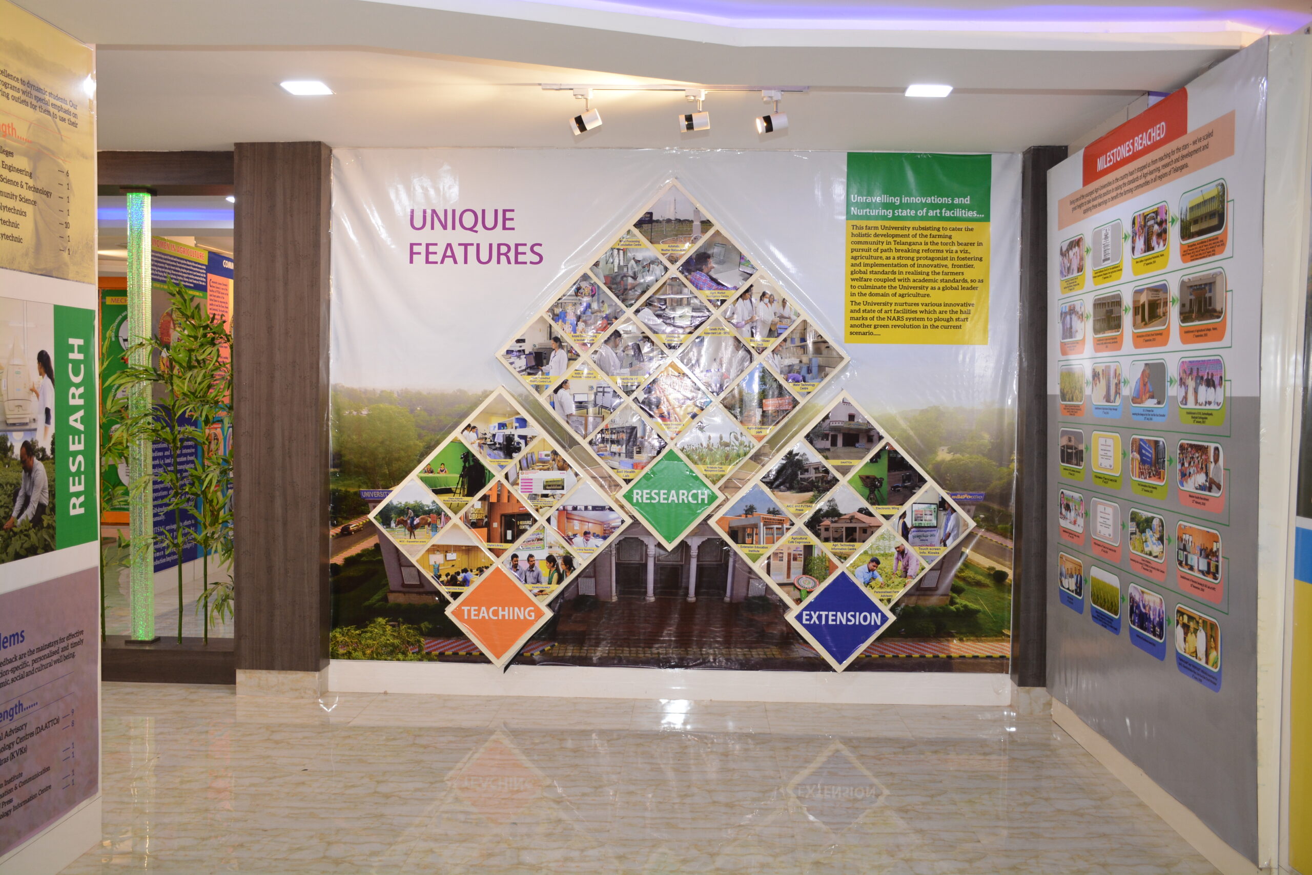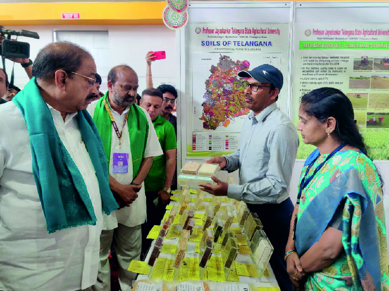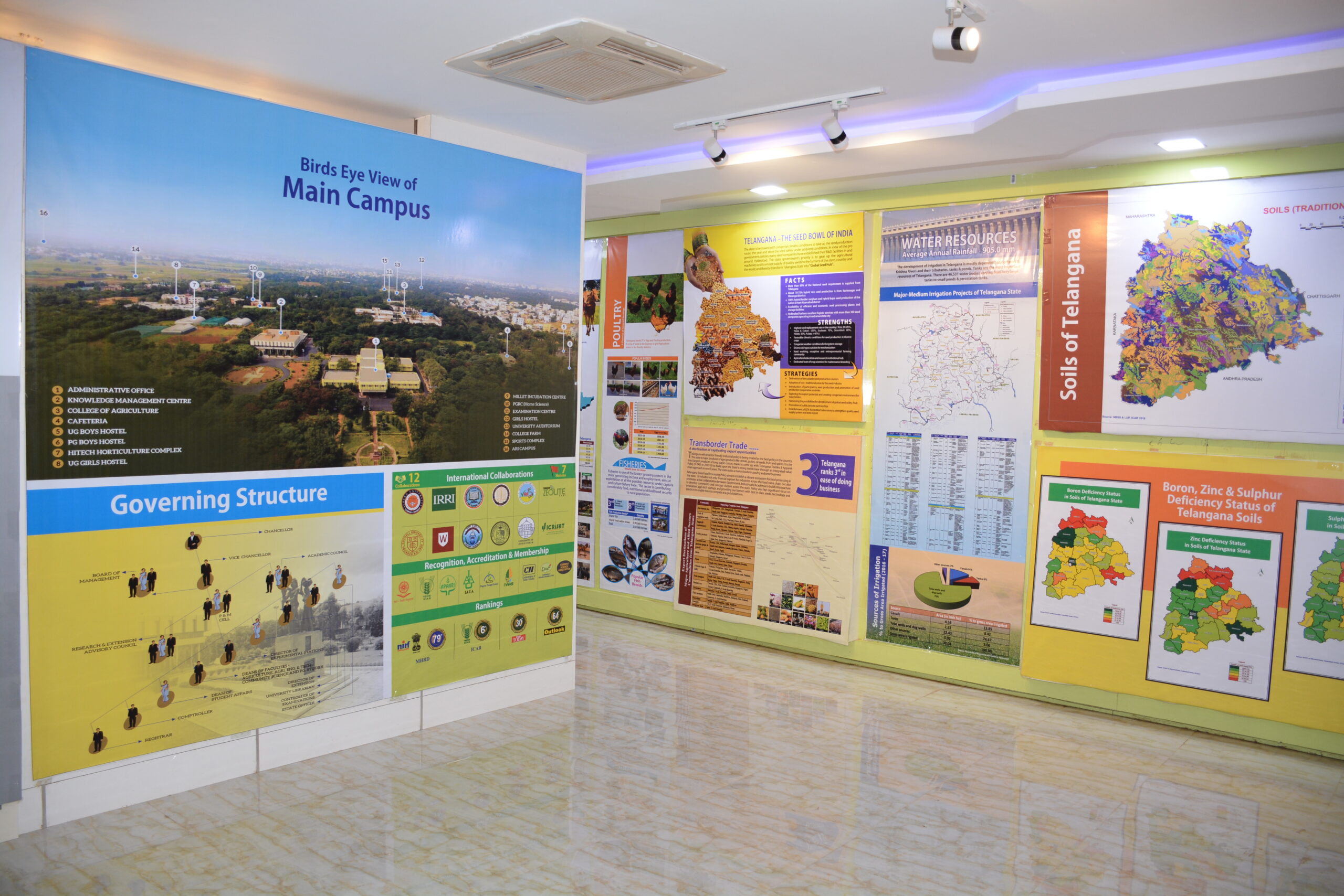 Agri Info Hub depicting the latest agro-technologies, activities and research findings of PJTAU was established for the benefit of visitors, students, farming community and other clientele at ground floor of administrative office, Rajendranagar. A showcase of university activities and technologies with an eye-catching display of updated information for info seekers, which is a single window delivery system/one stop solution provides all the latest information. The lineup of high-tech display includes traditional and modern farming, university mandate, monoliths of major soils of state, Agriculture in Telangana, PJTAU at a glance, Agricultural Education, crop improvement, production and protection, NRM, Farm Mechanization, Community Science, PHT and value addition and Transfer of Technology. To add to the already commendable lineup of diverse themes mentioned above, there is an eye grabbing innovative and integrated model depicting implementable agro technologies in rural landscape that was conceptualized and displayed at the center which is rated in high regards by the visiting officials and farmers. The destination became a standout center where it culminated a positive image in the hearts of the visitors by showcasing the thriving ecosystem of the University.