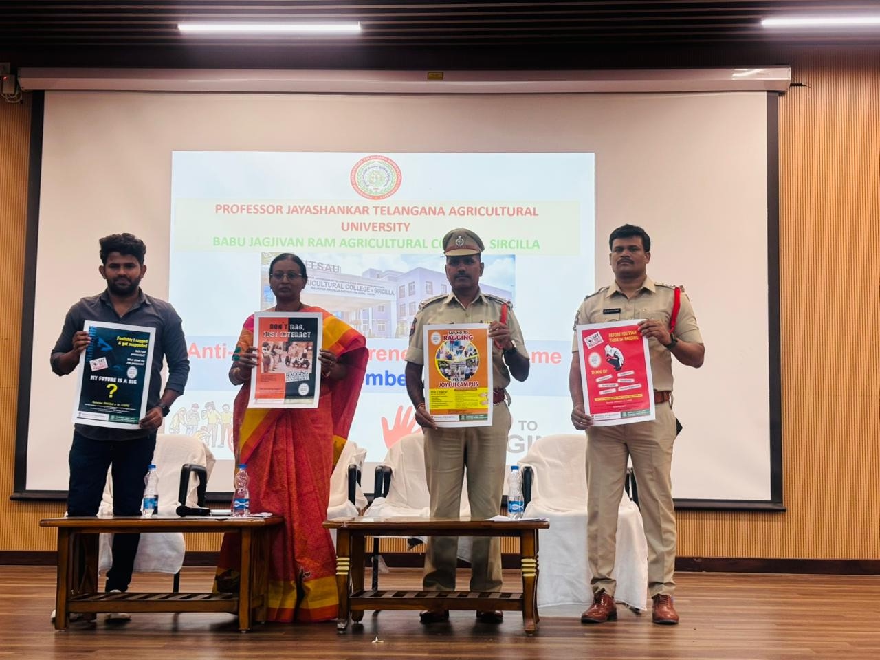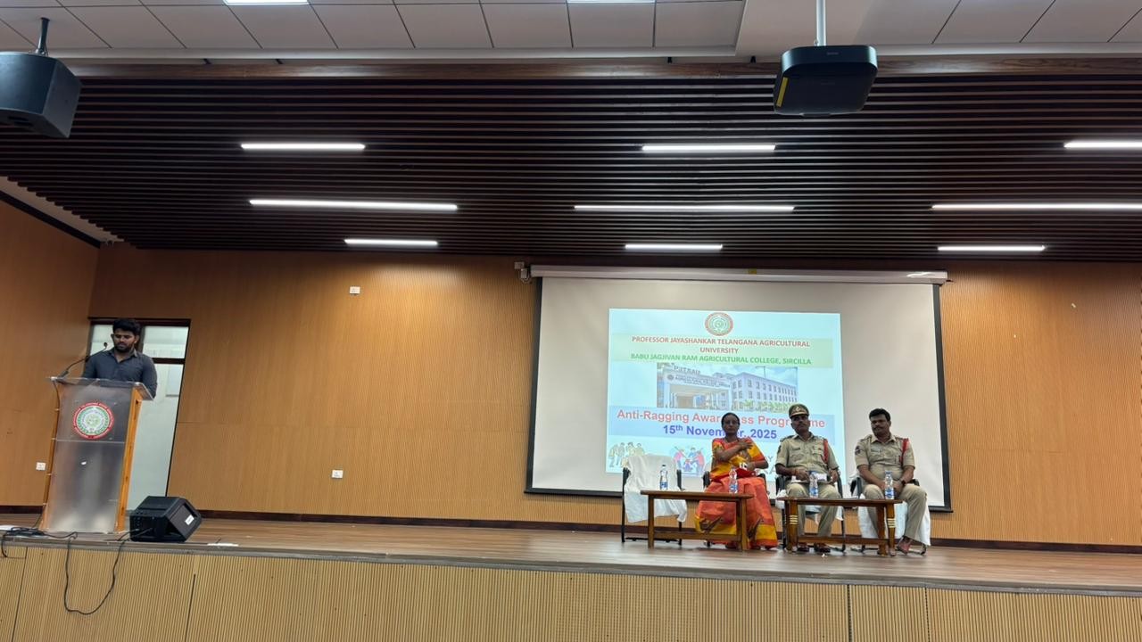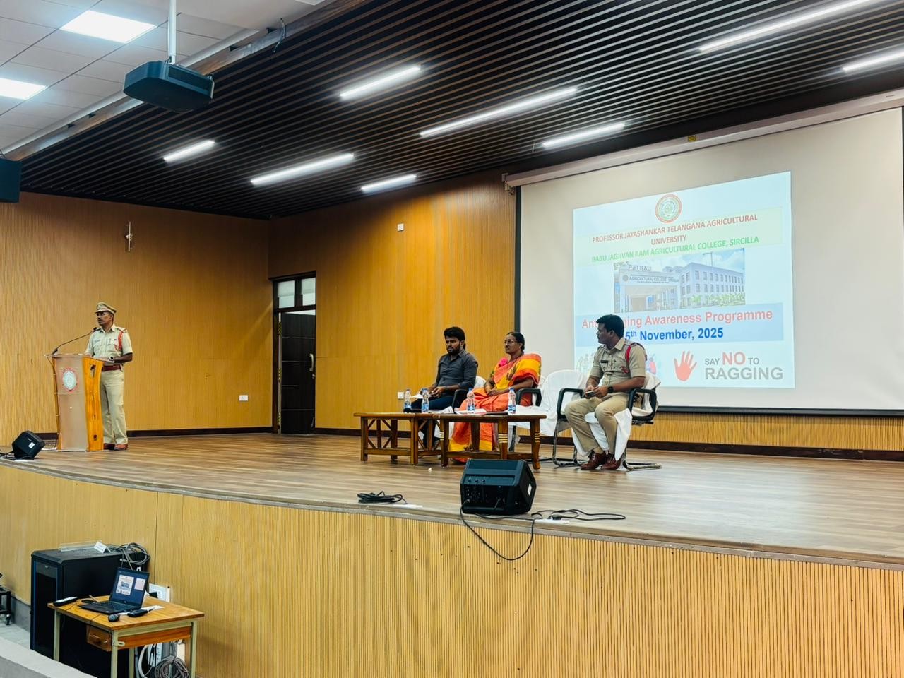 An Anti-Ragging Awareness Programme was conducted at BJR Agricultural College, Sircilla on 15.11.2025 with the objective of sensitizing students about the ill effects of ragging and ensuring a safe, respectful, and disciplined campus environment. The programme commenced with a brief introduction by Sri L. Raja, Assistant Professor and OISA who outlined and presented the the purpose of the event and highlighted the what is ragging and its consequences among students. Dr. K. B. Sunitha Devi, Associate Dean, addressed the gathering and explained what constitutes ragging, the legal punishments, and the measures taken by the college to curb the menace of ragging on the campus. She stressed the importance of maintaining discipline and assured that the college strictly follows all guidelines issued by the Anti-Ragging Committee and UGC regulations. The resource persons for the programme were Mr. Mogili, Circle Inspector, Sircilla and Mr. Upender Chary, Sub-Inspector, Thangallapalli. Circle Inspector Mr. Mogili delivered an informative talk on what ragging is and elaborated on the legal consequences, including FIRs, criminal charges, suspension, and imprisonment. He encouraged students to uphold dignity, respect peers, and immediately report any ragging incidents. Sub-Inspector Mr. Upender Chary spoke about the various forms of cybercrimes affecting youth today. He discussed issues such as cyberbullying, online harassment, identity theft, and misuse of social media, advising students to be cautious and responsible digital citizens.All the students and faculty has taken the Anti Ragging Pledge . The Associate Dean Faculty members and students facilitated resource persons for their valuable guidance and urged students to contribute to a ragging-free and cyber-safe academic environment.