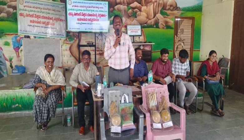 A One-Day Awareness Programme on Good Agricultural Practices (GAP) in Jowar for Sustainable Productivity was successfully conducted on 26.03.2026 at Rythu Vedika, Koilkonda, Mahabubnagar District under the SC-SP Programme of ICAR–IIMR. The programme was organized by the Regional Agricultural Research Station (RARS), Palem with the objective of creating awareness among farmers, particularly SC farmers, on scientific cultivation practices to improve productivity, sustainability, and climate resilience in jowar cultivation. Dr. Shashibhushan, Principal Scientist (Plant Breeding), RARS, Palem, acted as the In-charge and Head of the Programme and presided over the event. In his presidential address, he elaborated on the importance of the SCSP programme, its objectives, and the various benefits extended to farmers through improved technologies, capacity building, and institutional support. He emphasized the need for adopting scientific cultivation practices to enhance productivity and improve farmers’ income. Dr. P. Archana, TRVK Coordinator, Mahabubnagar, created awareness among farmers on digital agriculture tools, including the use of YouTube channels, Kisan Sarathi, and other mobile applications, which provide timely advisories and access to agricultural information. Dr. M. Shankar delivered a comprehensive lecture on pest and disease management in jowar, highlighting the importance of timely identification of pests and diseases and the adoption of integrated management practices to minimize crop losses. Dr. Kadasiddappa explained the best management practices (BMPs) in jowar cultivation, covering critical aspects such as appropriate sowing time, optimum spacing, nutrient management, and overall crop management practices to achieve higher productivity. Mr. Sriram Ajmera elaborated on high-yielding and improved jowar cultivars, explaining their potential advantages in terms of yield, adaptability to local conditions, and tolerance to biotic and abiotic stresses. Dr. K. Kalyani highlighted the importance of maintaining soil health and stressed the need for soil testing, balanced fertilization, and sustainable soil management practices. She also advocated the cultivation of climate-resilient crops like jowar to address the challenges posed by climate variability and ensure stable agricultural production. The programme witnessed active participation from the Mandal Agricultural Officer (MAO), Koilkonda, Sarpanch Mrs. Sujatha Anand, vice-Sarpanch Mr. Thirupathaiah Goud, Agricultural Extension Officer (AEO), and a 100 number of SC farmers from Koilkonda Mandal. The programme was interactive and highly beneficial, enhancing farmers’ knowledge and encouraging the adoption of improved agricultural practices for sustainable jowar productivity.