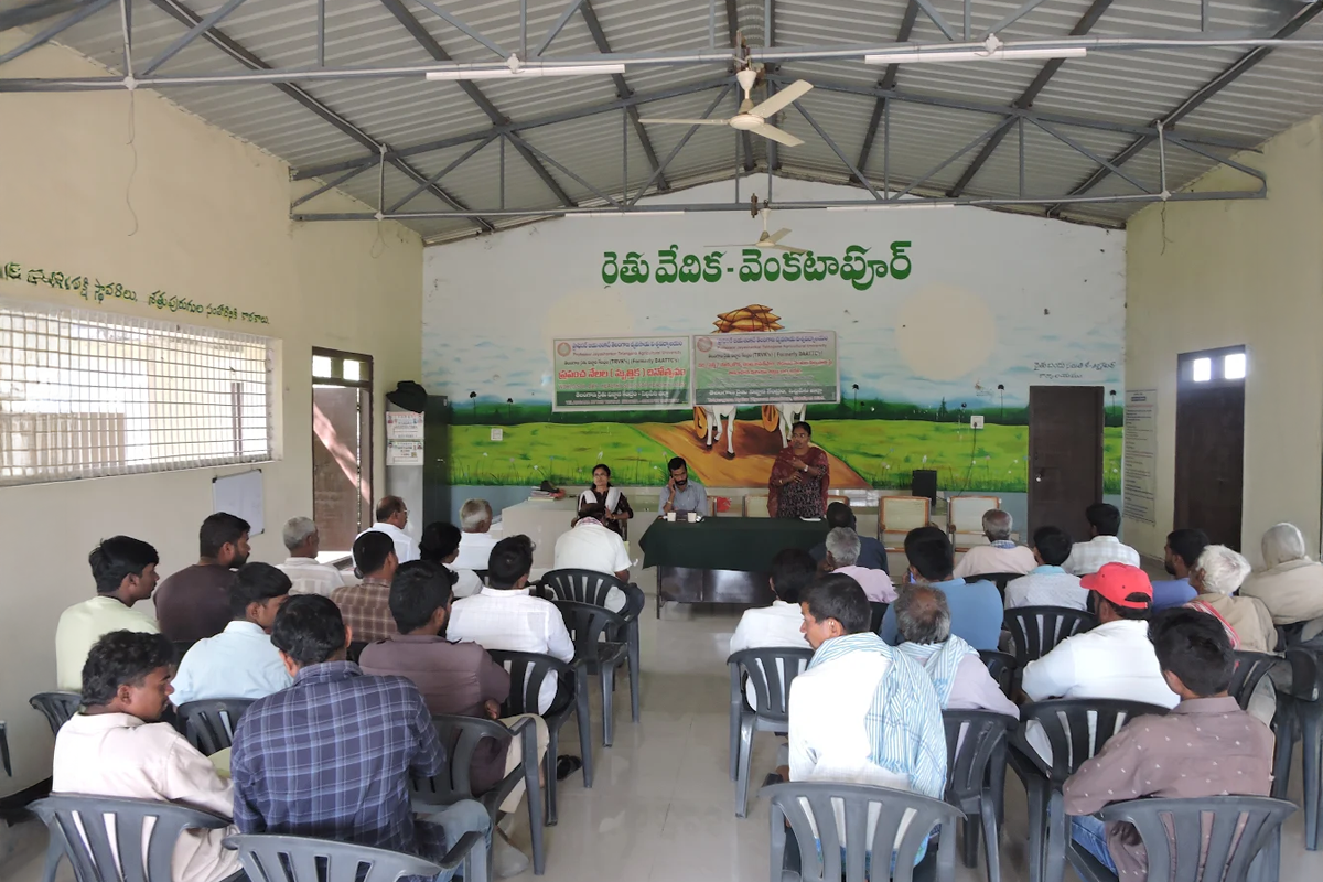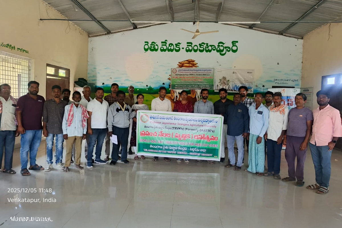 TRVK, Siddipet conducted Training cum Awareness Programme on “Crop residue management in Paddy/Maize/HDPS Cotton followed by subsequent crops” at Venkatapur (V) Rythu vedika, Siddipet Rural (M), Siddipet district on 05.12.2025. Dr. G. Santhosh Kumar, Scientist & Head, ARS, Tornala explained about the major crops which are grown in Telangana, management practices like bio-char making, incorporation of crop residues, conservation tillage. He described the role of crops and cropping systems on soil health. Later Dr. Ch. Pallavi, Coordinator & Scientist (CP) explained about pointed out that every year, around 290 lakh tonnes of crop residues are produced from three major crop like paddy, cotton and maize throughout Telangana per year and majority of the farmers burn these residues rather than adopting ecofriendly methods of incorporation into soil or composting for further use. She stressed the importance of insitu residue management involving leaving the residue on the field to be incorporated or mulched and exsitu residue management which involves collecting and transporting the residue for other uses like baled, biofuel production, animal feed. This approach reduces the need for burning, which pollutes the air, and helps recycle nutrients back into the soil. She also explained about different sustainable management practices for soil. In this programme MAO-Naresh, AEO-Navya, Coromandel company Scientist Pruthvi, Sales manager Siddareddy and 50 farmers participated. Later, on the eve of World Soil Day celebrated with farmers specially focusing on soil health management with slogan “Healthy Soils for Healthy Cities”.