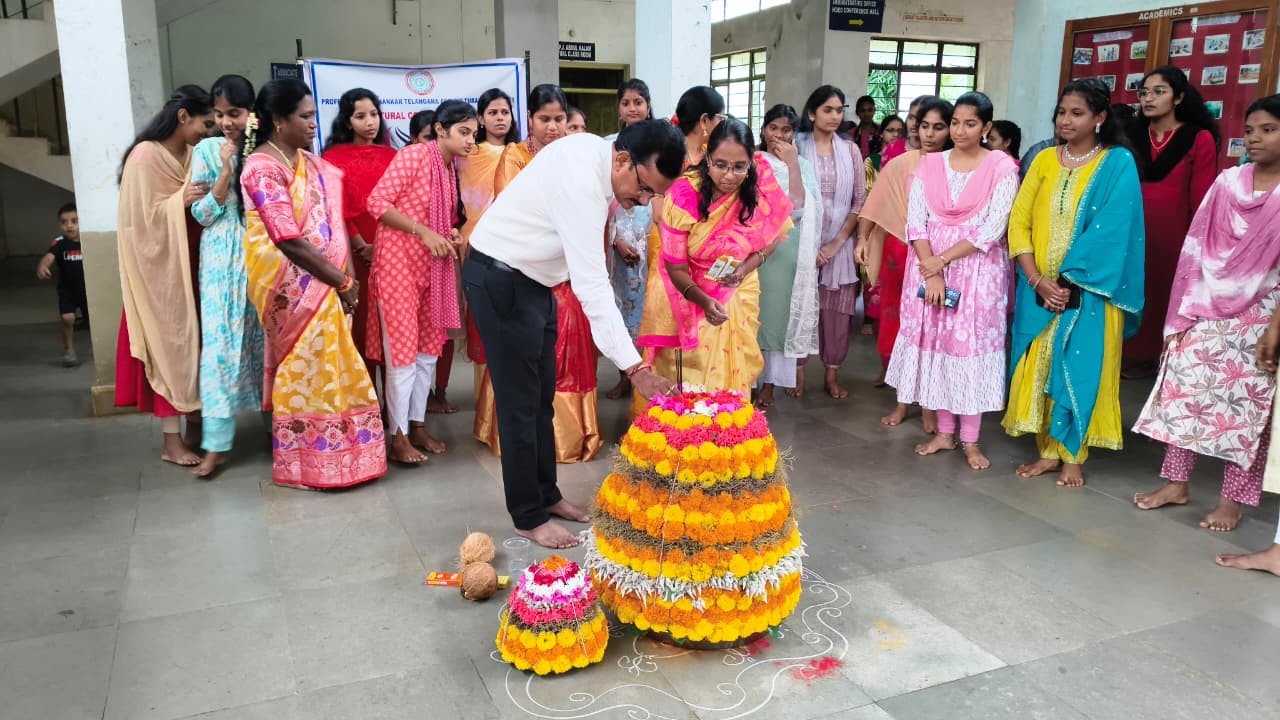 Bathukamma, the floral festival of Telangana, was celebrated with great enthusiasm and cultural pride at campus on 25.09.2025. The event was organized by Women Protection Cell to promote and preserve the rich traditions of Telangana. Students, teaching and non-teaching staff, especially women, came dressed in traditional attire. Students beautifully arranged Bathukammas made with seasonal flowers available in the campuslike Nerium, Bougainvillea, Celosia, Teak and Marigold. The Portico area was decorated with rangoli and festive decorations, creating a vibrant and joyful atmosphere.
