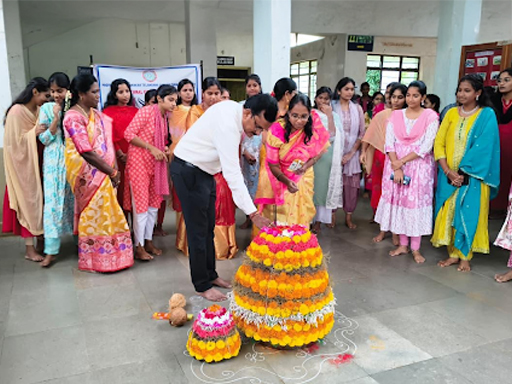 Bathukamma, the floral festival of Telangana, was celebrated with great enthusiasm and cultural pride at campus on 25.09.2025. The event was organized by Women Protection Cell to promote and preserve the rich traditions of Telangana. Students, teaching and non-teaching staff, especially women, came dressed in traditional attire. Students beautifully arranged Bathukammas made with seasonal flowers available in the campuslike Nerium, Bougainvillea, Celosia, Teak and Marigold. The Portico area was decorated with rangoli and festive decorations, creating a vibrant and joyful atmosphere.