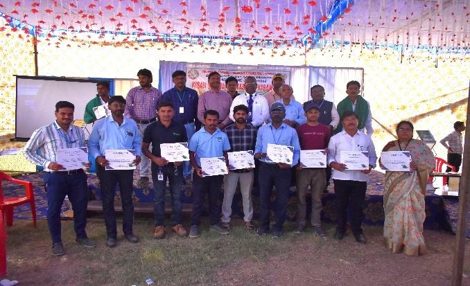 Krishi Vigyan Kendra (KVK), Bhadradri Kothagudem organized Kisan Samman Diwas–cum–Kisan Mela at the KVK campus on 23.12.2025. During the programme, 40 farmers from 24 Mandals of Bhadradri Kothagudem district were felicitated with Best Farmer Awards. The programme was graced by Sri. Duscharla Satyanarayana, Environmentalist; Dr. Chandrashekar, ADE, PJTAU; Sri. Mallaiah, District Veterinary and Animal Husbandry Officer (DVAO), Sri. Tata Rao, Assistant Director of Agriculture (ADA), Sri. Sujith Kumar, District Development Manager (DDM), NABARD; Sri. Satyanarayana, Regional Manager, State Bank of India (SBI); Sri. Nagaraju, Regional Manager, Telangana Grameena Vikas Bank; along with Dr. T. Bharath, Programme Coordinator, KVK, and Scientists Dr. N. Hema Sarat Chandra and Sri. B. Shiva. About 350 farmers participated in the programme and 15 exhibition stalls were arranged showcasing agricultural technologies and innovations.