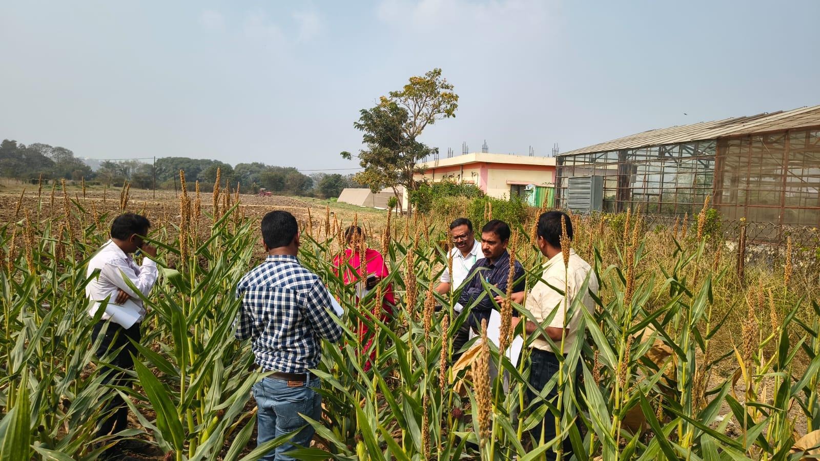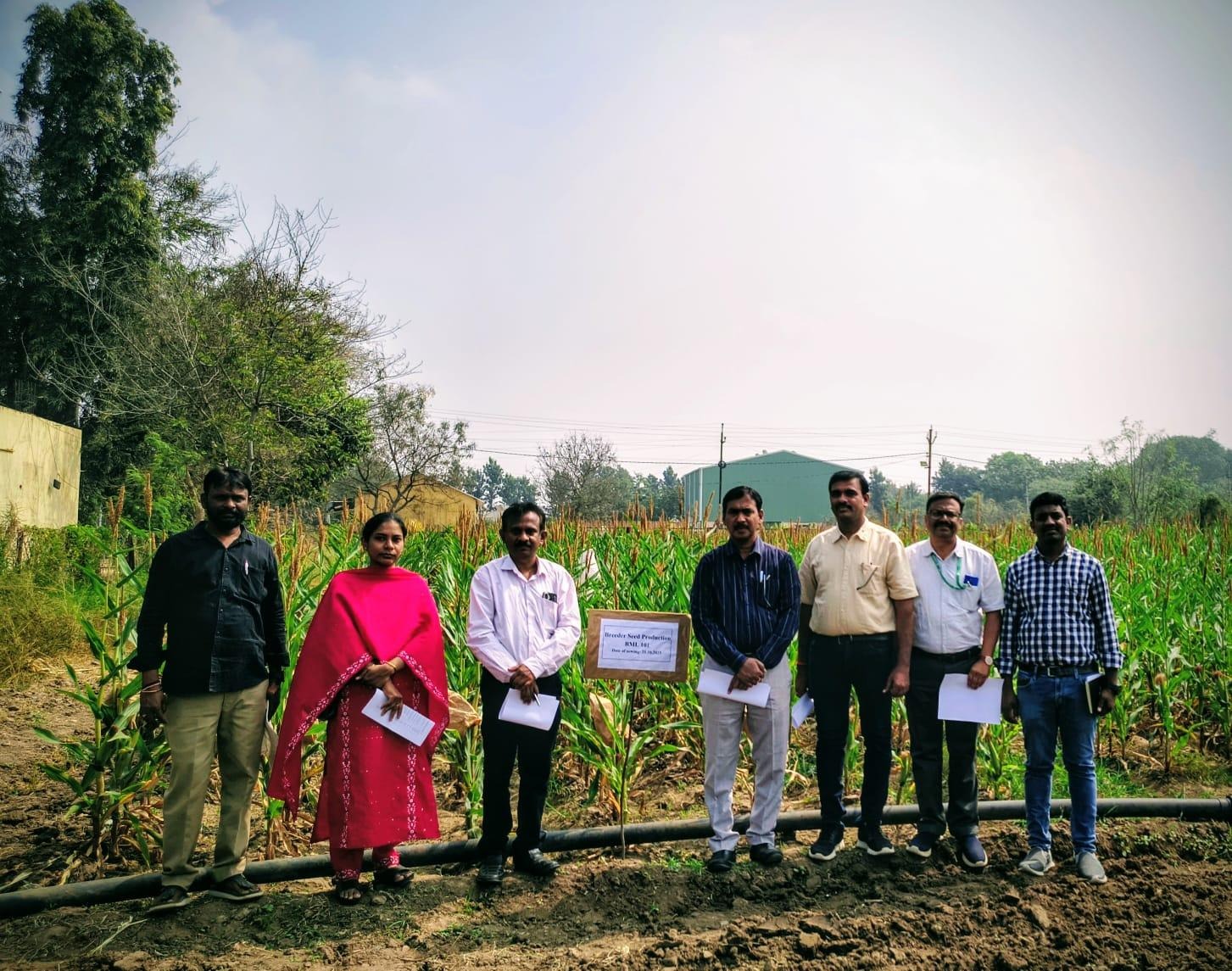 Dr. M V Nagesh Kumar, Director (Seeds) , PJTAU   visited the Maize Breeder seed production fields of BML 101 at Maize Research Unit, ARI, Rajendranagar on 30.01.2026 along with Dr. N. Sunil, Principal Scientist (Pl.Br) & Head, Winter nursery centre, ICAR- IIMR, Hyderabad, Dr. K. Sukumar, Principal Scientist (Pl.Br) , SRTC, Rajendranagar,         Sri. M. Shivakumar, Assistant Director of Seed certification, TGSCOA, Hyderabad, Smt. Rubeena Afrin, Regional Manager, TGSDC, Hyderabad and Smt. Anjali, Manager (Production), National Seed Corporation, Secundrabad. During the field visit Dr. D. Bhadru, Principal Scientist (Maize & Millets), briefed the team on the breeder seed production programme and explained the morphological characteristics and distinguishing features of BML 101. The Team closely observed the crop stand, uniformity, flowering behaviour, and overall field condition and expressed satisfaction with the quality of breeder seed production being maintained at the Maize research unit.
