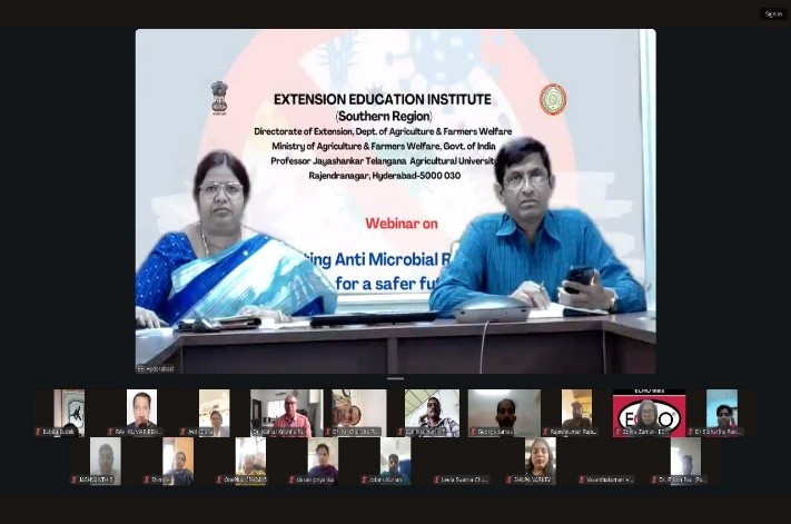 The Extension Education Institute (Southern Region), PJTAU, Hyderabad, organised a national-level webinar on ECHO – Combating Anti-Microbial Resistance: Strategies for a Safer Future on 24.11.2025. The programme brought together 107 participants from agriculture, veterinary, and medical sciences to highlight the growing threat of Antimicrobial Resistance (AMR) across sectors. The webinar commenced at 10:00 AM with a warm welcome by Dr. M. Preethi, Professor, EEI Hyderabad. Dr. M. Jagan Mohan Reddy, Director, EEI, outlined the objectives of the programme, emphasizing the urgent need for coordinated actions against AMR to safeguard human, animal, and environmental health. The first technical session featured Dr. Kamal Krishna Pal, Principal Scientist at Directorate of Groundnut Research Junagadh and Head, School of Drought Stress management, ICAR-NIASM, Baramati. He spoke on Antimicrobial Resistance in Crops and Soil: Safeguarding for Sustainable Agriculture highlighting emerging AMR risks in agricultural ecosystems, sustainable mitigation strategies, drivers of AMR and its repercussions on food, health and environment. In the second session, Dr. A. Vijaya Kumar, Associate Professor & Head, Veterinary Public Health and Epidemiology, CVSc, Mamnoor, Warangal, addressed AMR in Livestock: Protecting Animal Health and Food Safety. He stressed the need for prudent antibiotic use, surveillance, and field-level awareness among livestock stakeholders. The final session was delivered by Dr. Deepali Vagdalkar from Malla Reddy Medical College, Hyderabad, who spoke on “AMR in Healthcare: The Silent Clinical Crisis.” Her presentation shed light on the clinical implications of AMR, treatment challenges, and the importance of stewardship in healthcare settings. The webinar concluded at 1.30 PM with a vote of thanks by Dr. M. Preethi, who expressed gratitude to all speakers, participants, and collaborating institutions for their contribution toward fostering a One Health approach to combating AMR.