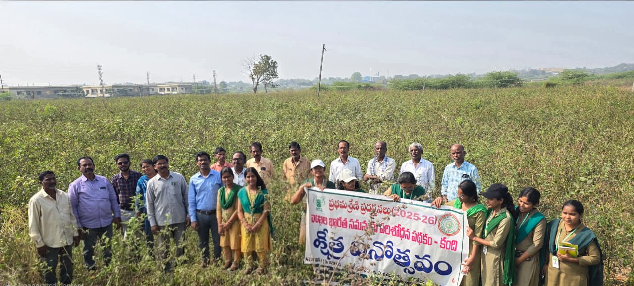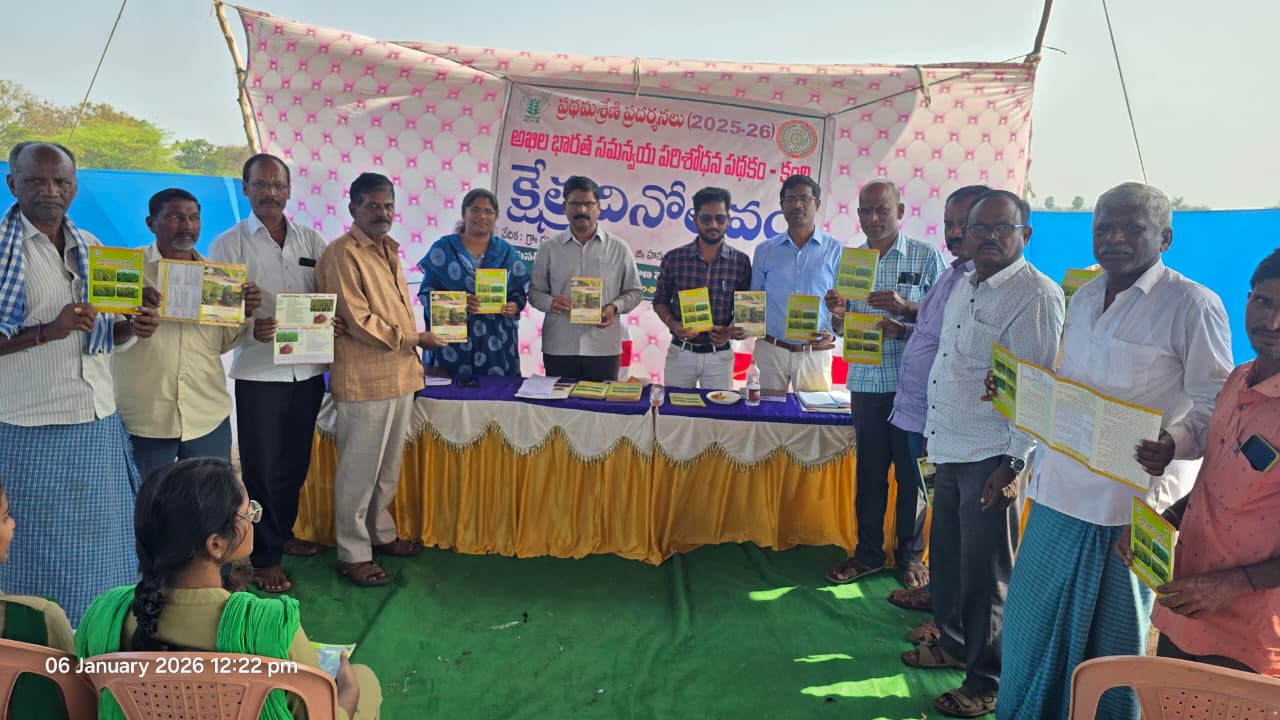 The Regional Agricultural Research Station, AICRP on Kharif Pulses (Pigeonpea), Warangal, conducted a field day on full package technology (FPT) as part of its front-line demonstration technical programme during 2025-26 at Dharmaram village, Geesugonda mandal, Warangal District, on January 6, 2026. Dr. A. Venkat Reddy, Principal Scientist (Entomology) & Head, AICRP on Kharif Pulses, RARS, Warangal, chaired the programme and addressed the farmers about the importance of cultivation of pigeonpea crop, pest management in redgram, Technologies for rabi cultivation of pigeonpea, Mechanization, and sensitized them about integrated pest management of Maruca vitrata and Helicoverpa armigera in pigeonpea. He urged the farmers to increase the area under pulses, enhance pulse production and productivity through the Pulses Mission “Aathmanirbharta” in the upcoming year, 2026. Later, Dr. M. Madhu, Scientist (Agronomy) & Officer in-charge, spoke on important of FLD programme, better management practices for pigeonpea cultivation for better yields and enhancing soil health, market price, and market facilities for procuring the seed at a suitable price, as well as information on harvesting the crop and the importance of mechanization in pigeonpea. Later, Dr. G. Seshu, Scientist (Plant Breeding), briefed the farmers on the use of drone in redgram crops and clarified their queries on drone technology. Dr. G. Padmaja, Scientist (Plant Pathology), explained about better management practices for controlling dry root rot and Sterility mosaic diseases in Redgram, as well as prophylactic measures for sterility mosaic viral disease. Later, the FLD farmers, Sri Godasi Lingamurthy, Sri Bollem Vidyasagar, and Sri Madineni Showraiah, shared their experiences with fellow farmers on the Field Day about the Front-Line Demonstration taken up in their fields, specifically the FLD-Pigeonpea FPT with variety (WRGE-121 & WRGE-97). The programme was followed by a field visit, during which all queries were clarified, and farmers expressed satisfaction with the crop performance and their willingness to adopt the technologies on a large scale. In this programme, about 40 farmers from Dharmaram, Vanchanagiri, Geesugonda and Ladella mandals of Warangal district and RAWEP students of B.Sc. (Agriculture) participated in the meeting.