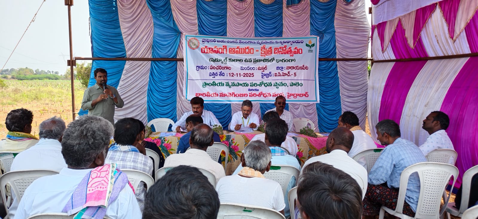To enhance the area under rabi castor cultivation, the AICRP on Castor team at RARS, Palem has conducted 50 demonstrations in farmers’ fields under the Scheduled Caste Sub-Plan (SC-SP). These demonstrations focused on the adoption of improved production technologies particularly high-yielding cultivars to improve productivity and profitability. In this context, a field day was organized at the farm of Sri Anjaneyulu in Panchalingala village, Makthal mandal, Narayanpet district where the improved castor cultivar ICH-5 was demonstrated. The programme was organized by a team of scientists from AICRP on Castor, RARS, Palem comprising Dr. K. Sadaiah, Scientist (Plant Breeding), Dr. G. Eswara Reddy, Scientist (Plant Breeding), and Dr. V. Divya Rani, Scientist (Plant Pathology) under the chairmanship of Dr. M. Sreedhar, Principal Scientist (Oilseeds). The event was also attended by scientists from the ICAR-Indian Institute of Oilseeds Research (ICAR-IIOR), Hyderabad, including Dr. V. Dinesh Kumar, Principal Scientist (Biotechnology), Dr. Senthilvel Senapathy, Principal Scientist (Plant Breeding) and Dr. T. Manjunatha, Senior Scientist (Plant Breeding). At the outset, Dr. K. Sadaiah highlighted the importance of the programme and emphasized the need to expand castor cultivation in the state. The host farmer Sri Anjaneyulu, shared his experiences and the crop management practices he adopted to raise a healthy crop. This was followed by an interactive session in which farmers raised queries regarding pest and disease management as well as marketing opportunities. Later, Dr. G. Eswara Reddy elaborated on good agricultural practices for achieving higher yields in castor. Dr. V. Divya Rani discussed effective pest and disease management strategies in castor. Dr. M. Sreedhar has emphasized the importance of reintroducing traditional crops in the region and stressed the need for crop diversification. Subsequently, Dr. T. Manjunatha explained the varietal characteristics of ICH-5 and detailed important agronomic practices such as optimum spacing and suitable sowing time. Dr. Senthilvel Senapathy spoke about the latest technologies for managing biotic stresses in castor. Dr. V. Dinesh Kumar educated farmers on advanced technologies developed by ICAR-IIOR, including high-density planting, application of growth retardants, seed treatment with Trichoderma and the use of biopolymers. Agricultural Extension Officers (AEOs) Sri Vijay and Vyshnavi also interacted with farmers and discussed challenges faced in cultivating crops such as cowpea, chilli and tomato with the group of scientists. Scientists addressed the queries raised by both farmers and Department of Agriculture officials. The programme concluded with a field visit to the ICH-5 castor demonstration plot, where farmers closely observed the crop and engaged in detailed discussions on its varietal characteristics, overall performance, and effective pest management practices with scientists.