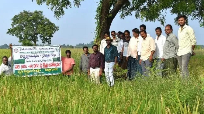 Krishi Vigyan Kendra, Bhadradri Kothagudem organized two Field Days on Paddy varieties WGL-44 and WGL-1537 at Janakipuram (V), Annapureddypalli (M) and Surampalem (V), Mulakalapally (M) under PJTAU Flagship Programme on “Quality Seed for Every Village.” on 16.10.2025.Dr. T. Bharath, Programme Coordinator briefed the farmers about the importance of quality seed production and highlighted the distinct characteristics and advantages of paddy varieties WGL-44 and WGL-1537. He emphasized that farmers should produce and supply quality seed to fellow farmers to promote self-sufficiency in seed availability at the village level.