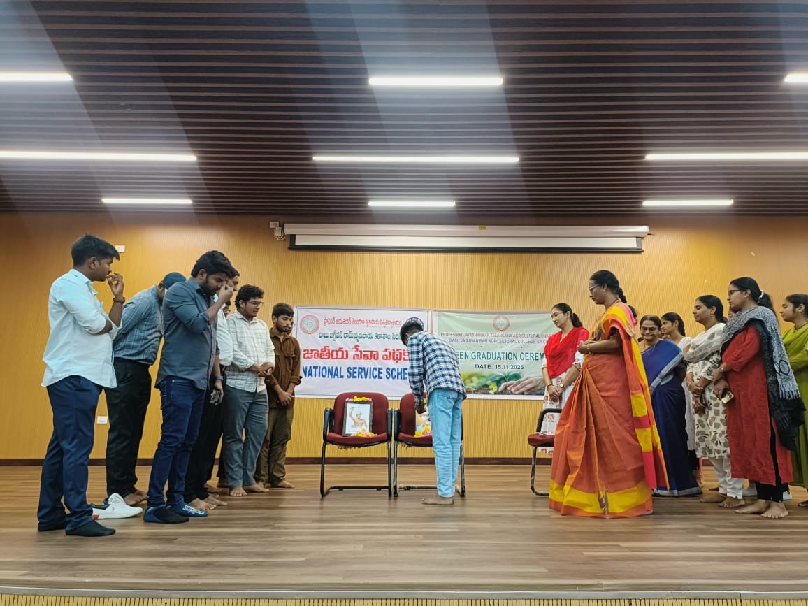 The NSS Unit of BJR Agricultural College, Sircilla observed Janjatiya Gaurav Diwas to honour the invaluable contributions and sacrifices of India’s tribal freedom fighters. The programme began with an introductory address by NSS Programme Officer Dr. G. Priyadarshini, who highlighted the significance of the day and spoke about the courage and leadership of two iconic tribal leaders—Komaram Bheem and Birsa Munda. She emphasized their unwavering fight against oppression and their role in safeguarding tribal rights, identity and culture. The Associate Dean, Dr. K. B. Suneetha Devi then addressed the gathering and highlighted the importance of commemorating Janjatiya Gaurav Diwas, noting that such events inspire students to learn about the nation’s tribal heritage and honour the legacy of leaders who played a crucial role in India’s freedom struggle. Following the formal addresses, the Associate Dean, faculty members, NSS volunteers and students offered floral tributes to Birsa Munda and Komaram Bheem, remembering their heroic contributions and reaffirming the values of courage, justice and social harmony.