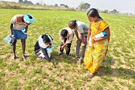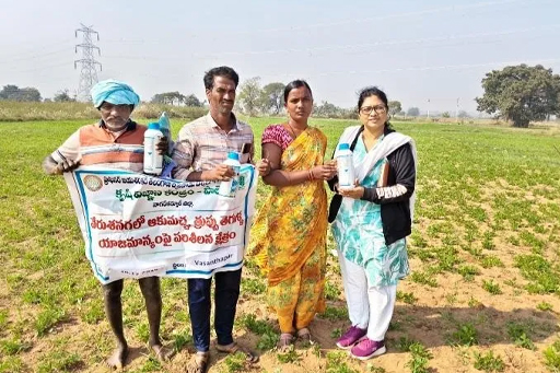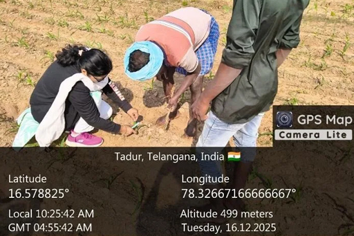 As part of the technical programme, KVK, Palem implemented an On-Farm Trial (OFT) on Assessment of Integrated Disease Management (IDM) in groundnut at five different locations. Inputs such as Tebuconazole, Trichoderma harzianum, and Chlorothalonil were distributed for the management of major foliar diseases, namely tikka leaf spot and rust. Further, a diagnostic field visit was conducted in the neighboring fields. The groundnut crop is at the vegetative stage (45 days). Spodoptera litura infestation was observed above the Economic Threshold Level (ETL) (2 larvae per plant, randomly). The SMS (Plant Protection) advised installation of pheromone traps @ 4–5 per acre and spraying of Chlorantraniliprole @ 60 ml per acre. Farmers were also sensitized on Integrated Pest Management (IPM) practices in groundnut, with special emphasis on the preparation and use of poison bait for managing late instar larvae of S. litura. The maize crop is at the vegetative stage (40 days), where Fall Armyworm (FAW) incidence was observed below ETL. Farmers were advised to remain vigilant and undertake need-based management measures if pest incidence increases. In this programme Dr. O. Shaila, SMS (Plant Protection), Y. Sultan Young Professionals, KVK, Palem and 4 farmers were participated.
