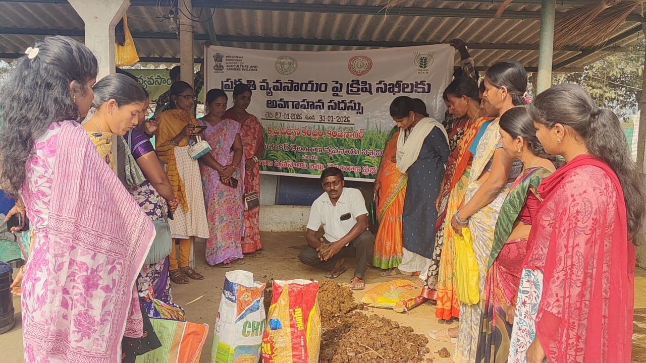 A Training Programme on “Natural Farming” under National Mission on Natural Farming Project 2025-26 was organized by Krishi Vigyan Kendra, Kampasagar in collaboration with Department of Agriculture, Nalgonda for 5 days from 27.01.2026 to 31.01.2026 at KrishiVigyan Kendra, Kampasagar, Thripuraram mandal Nalgonda district. The training was inaugurated on 27.01.2026 with a welcome address and Lighting of Lamp. Sri. Sravan kumar District Agriculture officer, Nalgonda acted as chief guest and he highlighted the importance of Natural farming for Sustainable agriculture. Dr. K. Chandrashaker, Programme coordinator, KVK, Kampasagar acted as chairperson for the programme and he highlighted the key issues of Natural farming for Sustainable agriculture, the vital role of Krishi Sakhis in its promotion and the role of Krishi Sakhis in advisory services and action planning. Dr. N. Lingaiah, Pricipal Scientist and Head, ARS, Kampasagar explained about principles of Natural Farming. Sri Anji Reddy, Progressive farmer, Nalgonda shared his experience in Natural farming. The inaugural session was concluded with formal vote of thanks. The technical session of the programme on first day (27.01.2026) was explained by Dr. K. Chandrashaker, SMS(Crop Production) on Key aspects of Natural farming and soil health management. On second day (28.01.2026) Smt. A. Ramulamma SMS (Plant Protection) KVK, Kampasagar was explained about Role of Krishi Sakhis in National Mission on Natural Farming Project and Pest Management techniques in Natural Farming. On third day (29.01.2026) Dr. T. Bharath kumar, SMS(Crop Production) , KVK, Bhadradri Kothagudem participated as resource person and delivered the lecture on Integrated farming system. A practical session on Bio inputs preparation was taken by N. Somaiah, Farmer master trainer, Neelaigudem. On fourth day (30.01.2026) Dr. Lavakumar, Retd. Scientist, delivered the lecture on preparation of Bio fertilizers and its role in Natural Farming. A practical session on Bio inputs preparation was taken by V. Anjaneyulu, Organic farmer, Marrigudem. On 5th day (31.01.2026) Conducted a Field visit to Anjasri Natural Farm in Charlapalli village. The host farmer V. Anjireddy shared his journey and experience to trainees and explained about his marketing strategy of natural farm produce. Conducted valedictory session and distributed training manuals to the participants. In this programme, Sri. Sravan kumar District Agriculture officer, Nalgonda, Dr. N. Lingaiah, Pricipal Scientist and Head, ARS, Kampasagar, Dr. K. Chandrashaker, Programme coordinator, Smt. A. Ramulamma, SMS (Plant Protection) Smt. T. Himabindu, SMS (Horticulture), and 30 no. of Krishi Sakhis, MAOs and AEOs of Natural farming clusters, were participated.