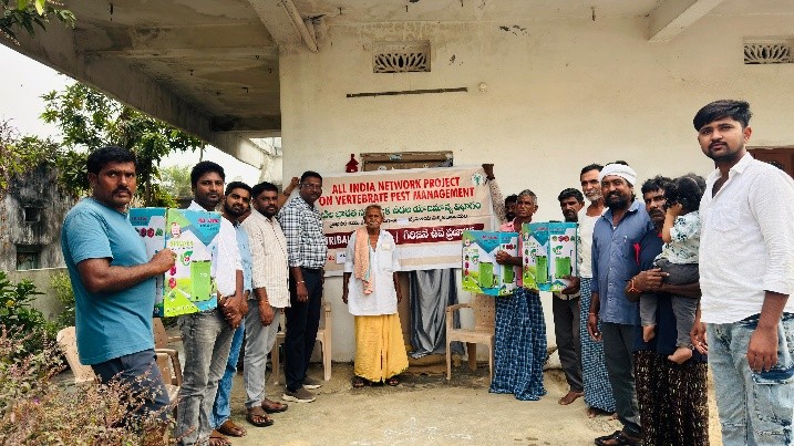 An awareness programme on protection of crops from monkey menace and wild boar problem was conducted in collaboration with scientists from AICRP–Vertebrate Pest Management (VPM), Hyderabad. As part of the programme, two solar fencing units and six battery-operated sprayers were distributed to farmers at Rayapadu Village Allapally Mandal, Seethampeta Banjara Village, and Sujathanagar Mandals of Bhadradri Kothagudem District