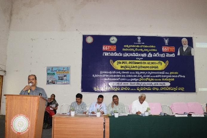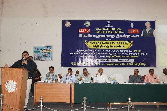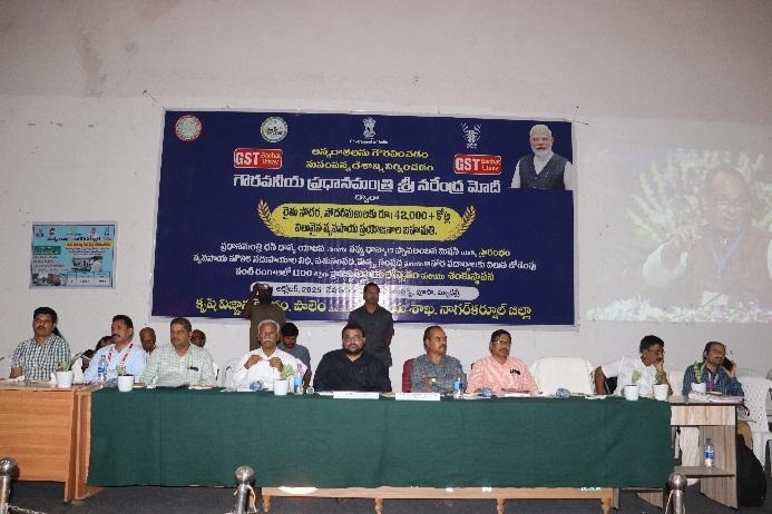 KVK, Palem in collaboration with Department of Agriculture organized “Pradhan Mantri Dhan Dhanya Krishi Yojana (PM-DDKY) & Mission for Aatmanirbharatha in Pulses Schemes Launch – Live webcast and Farmer Scientist Interaction” at Auditorium, RARS, Palem, Bijinepally (M), Nagarkurnool (D) on 11.10.2025. Sri. B. Santhosh, District Collector, Nagarkurnool, graced the occasion as Chief Guest and addressed the gathering. He stated that the launch of PM-DDKY and Mission for Aatmanirbharatha in Pulses provides a great opportunity for small and marginal farmers to enhance agricultural productivity and increase their income. He further mentioned that the programme will be implemented for the next five years, ensuring long-term benefits for the farming community. Sri. N. Yashwanth Rao, District Agriculture Officer, Nagarkurnool, highlighted the major objectives and significance of the PM-DDKY programme, which include promoting crop diversification and sustainable agricultural practices, supporting allied sectors such as dairy, fisheries, and poultry, and encouraging women and youth participation in agriculture and allied activities. He also emphasized the importance of post-harvest management, value addition, and reduction of post-harvest losses.