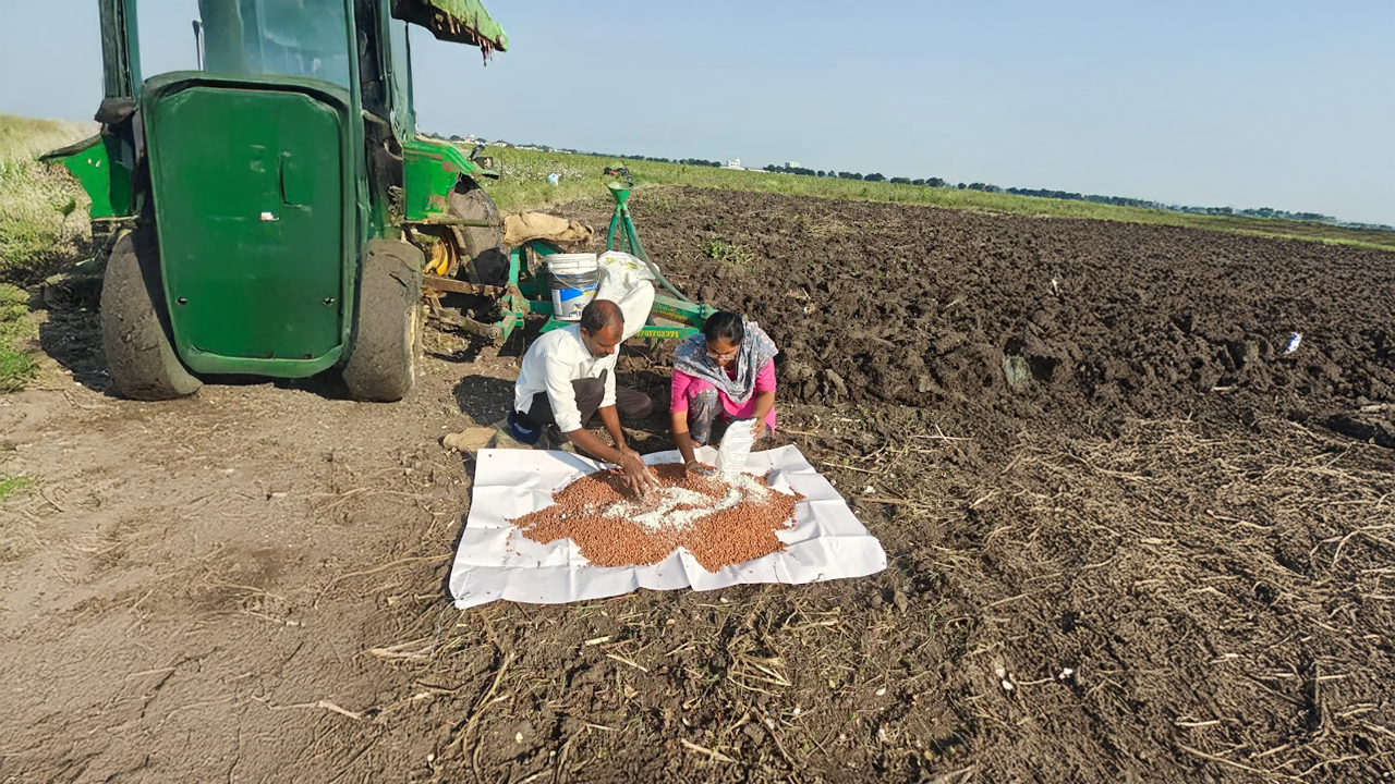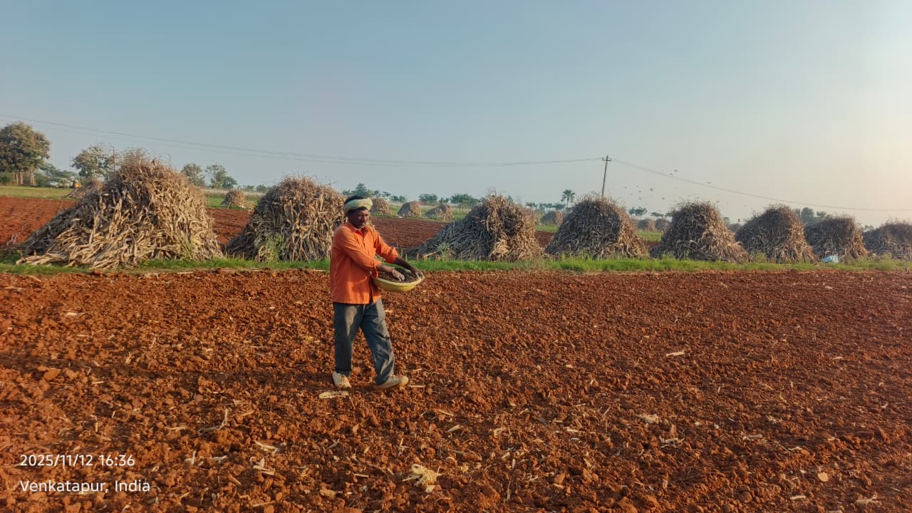 TRVK, Siddipet conducted method demonstration of Trichoderma viridae for soil application in maize field affected by wilt on 13.11.2025 at Gudikandula (V), Thoguta (M). 1-2 kg/ acre of Trichoderma viridae powder is added to 25 kg of FYM, mixed thoroughly and applied to the one acre field where frequent occurrence of wilt in maize. Also conducted method demonstration of Trichoderma viridae of seed treatment in bengal gram at Alirajpet (V), Jagdevpur (M) on 15.11.2025. Dr. Ch. Pallavi, Coordinator & Scientist (CP), briefed about the importance of seed treatment in pulses and demonstrated seed treatment in bengal gram with bio-control agent Trichoderma viride @ 8-10g/kg seed for wilt management and explained about the precautions to be taken while treating the seed (NBeG-776). In this programme, farmers actively participated and their queries were clarified. In this programme 20 farmers were participated.