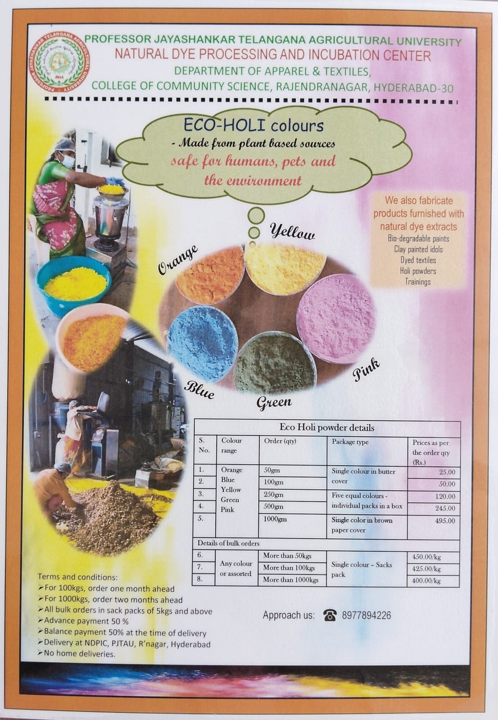 The Natural Dye Processing and Incubation Centre (NDPIC) was established in 2016 by the Department of Apparel & Textiles, College of Community Science, Professor Jayashankar Telangana Agricultural University (PJTAU), Hyderabad, with financial support from the Telangana State Pollution Control Board, Government of Telangana.