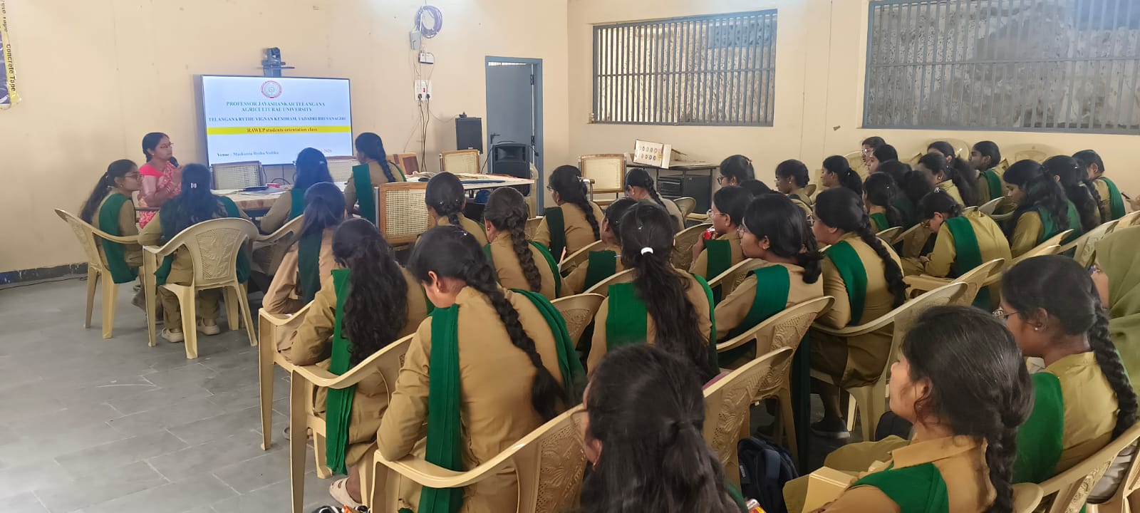 TRVK Yadadri Bhuvanagiri has conducted orientation program of RAWEP Students, College of Agriculture,Rajendranagar who are stationed in the following villages: Bommaipally (6 students), Tajpur (6 students), Anajipuram (4 students), Wadaigudem (5 students), Chanduputla (5 students), Muttireddygudem (5 students), Bollepally (5 students), Tekula Somaram (5 students), Rajapet(5 students). In the program Dr. D. Sreelatha, Principal Scientist and Coordinator, TRVK Yadadri Bhuvanagiri briefed the students on key activities involving crop production, crop protection, agricultural extension and rural economics. Also explained about the Biometric observations, Organic Farming, Economics of different crops, Soil Sampling Methods etc. The session also detailed upcoming visits to various Agricultural Research Stations (ARS), farmer organizations and protected cultivation units, etc. Young professionals and all students are present. The program was conducted under the guidance of Dr. D. Sreelatha, Coordinator of the Rythu Vigyan Kendra.