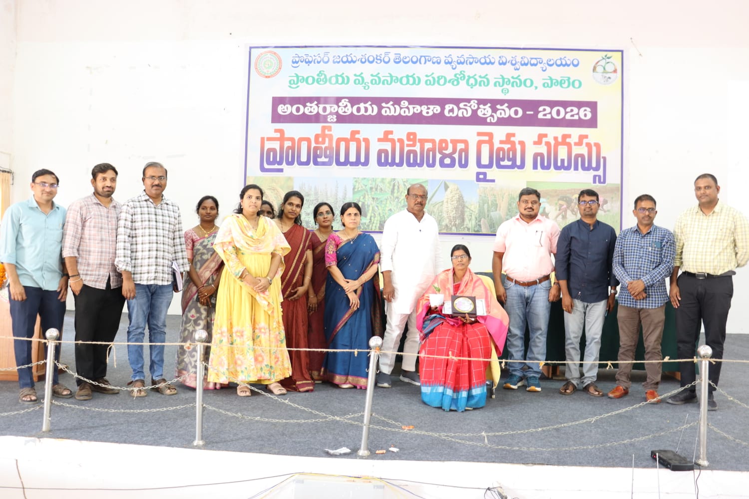The Regional Agricultural Research Station (RARS), Palem organized a “Pranteeya Mahila Rythu Sadassu” on 08.03.2026 at the Auditorium, RARS, Palem, on the eve of International Women’s Day. The programme primarily focused on women farmers, with the objective of showcasing cutting-edge agricultural technologies, improved crop varieties, innovative digital and IoT-based solutions, quality inputs and scientific farming practices for the benefit of farmers of Telangana State. This initiative was conducted as part of the University’s continued commitment to farmer-centric extension and outreach activities.