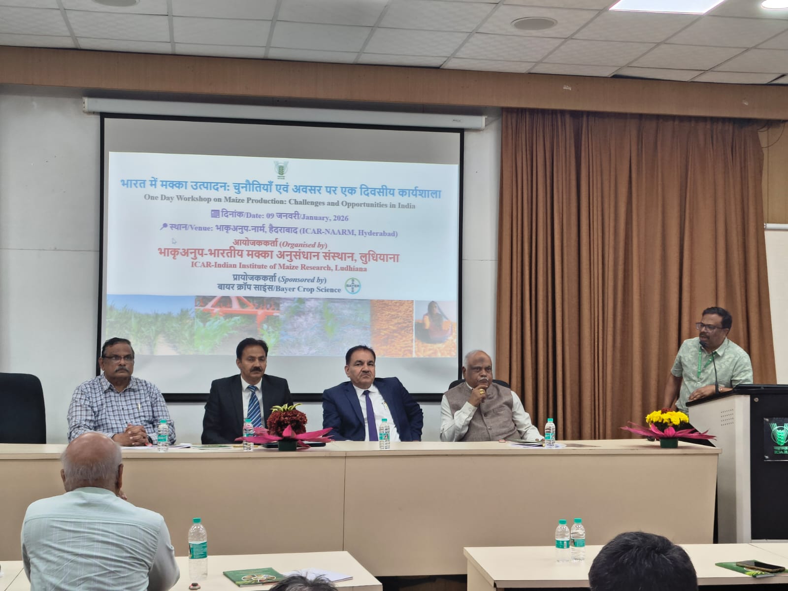 Dr. M. Balram, Director of Research, Professor Jayashankar Telangana State Agricultural University (PJTAU), participated in the valedictory session of a three-day national-level workshop on “Real-Time Data Acquisition for Maize” organized by the ICAR–Indian Institute of Maize Research (IIMR), Ludhiana along with Dr. HS Jat, Director , IIMR, Ludhiana and Dr. Gopal Lal Director (Acting) on 09.01.2026 at NAARM, Hyderabad. The workshop was aimed at enhancing the capacity of researchers and scientists in the use of modern tools and technologies for real-time data collection, monitoring, and analysis in maize research. During the valedictory session, Dr. M. Balram, Director of Research, PJTAU highlighted the importance of adopting real-time data acquisition systems in agricultural research to address current challenges such as climate variability, resource-use efficiency and sustainable crop productivity and also distributed the certificates to the participants of the workshop. Dr. M. Balram, Director of Research, PJTAU also inaugurated the container facility at the Winter Nursery Centre (WNC), IIMR, Rajendranagar, Hyderabad on 9th January, 2026 along with Dr. HS Jat, Director, IIMR, Ludhiana, Dr. M.V Nagesh Kumar, Director (Seeds) and Dr. SK. Rao, Professor practice. Dr. R. Susheela, Principal Scientist (Agro) & Head, Scientists of MRU, ARI, Rajendranagar and ICAR-IIMR scientist participated in this event.