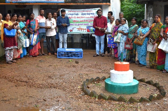 Krishi Vigyan Kendra (KVK), Bhadradri Kothagudem organized a programme on the promotion of backyard poultry and distribution of 300 Sonali poultry birds (35 days old) under the Tribal Sub Plan (TSP) on 03.11.2025 at Nallabanda Bodu village and Julurupadu mandal, Bhadradri Kothagudem district. During the programme, Dr. T. Bharath, Programme Coordinator, briefed the participants on the importance of backyard poultry for employment generation and nutritional security among tribal farmers. He also explained various KVK activities and encouraged farmers to utilize KVK services for accessing quality seed material and adopting cost-saving technologies in different crops. Sri B. Shiva, SMS (Horticulture) & TSP In-charge, along with the local Agricultural Extension Officer (AEO), coordinated the event. A total of 35 women farmers and farm women actively participated in the programme.