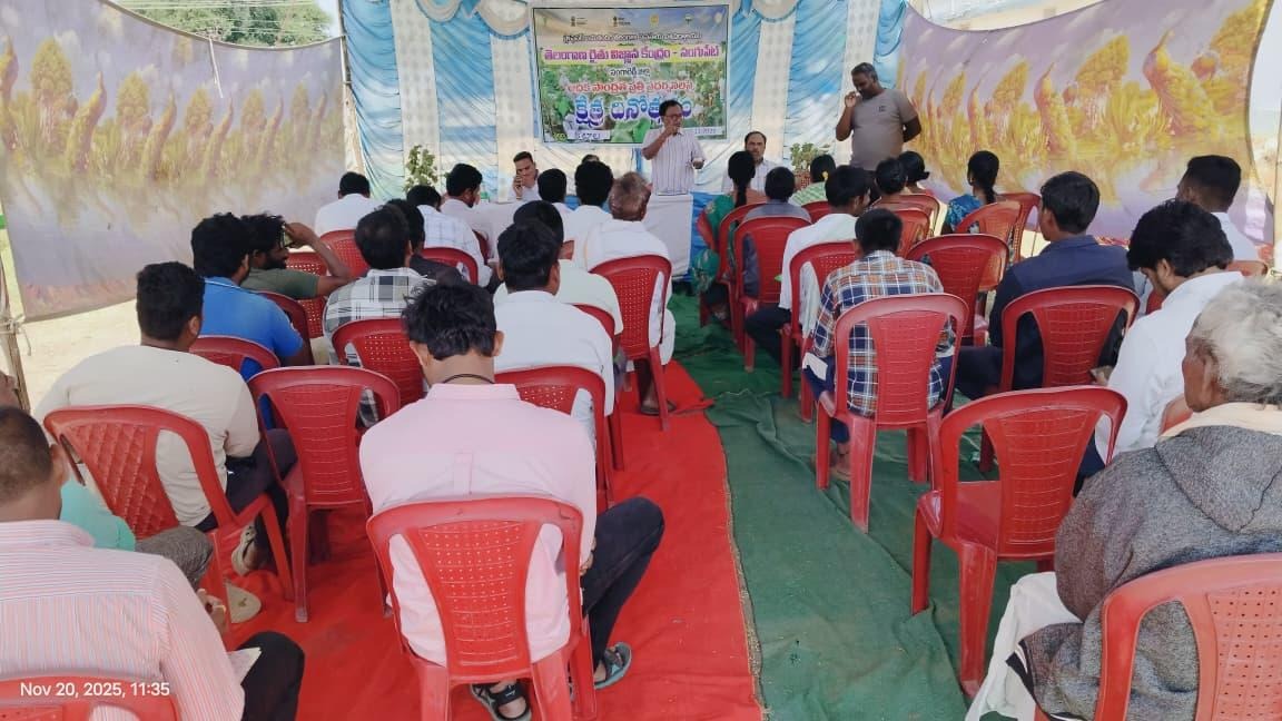 A field day on High-Density Planting System (HDPS) cotton was organized today at Kottala village of Andole mandal under the guidance of the Telangana Rythu Vigyan Kendra (TRVK), Sangupet. The program was conducted in the field of farmer M. Chandra Shekar Reddy, who adopted the HDPS method for cotton cultivation. Speaking on the occasion, RVK Coordinator and Scientist Sri. K. Rahul Vishwakarma explained that compared to normal cotton cultivation, the HDPS method increases the number of plants per acre—about 22,222 to 25,000 plants—which leads to higher yields. He mentioned that because the crop duration is shorter and the flowering and boll formation occur uniformly, the harvest can be completed earlier, helping farmers escape pink bollworm infestation and ensuring better net income. The farmer also shared his experience, stating that the crop growth and flowering were excellent under this method. District Agriculture Officer Sri. K. Shiva Prasad addressed the farmers, highlighting that HDPS allows farmers to complete the first crop early and provides an opportunity to sow a second crop within the same year. The event was attended by Jogipet Division Assistant Director of Agriculture G. Rama Devi, Mandal Agriculture Officer Srihari, AEOs, Young Professional-2 Rekha Manoj, Young Professional-1 S. Srikanth, K. Akash, Nuziveedu Seeds Marketing Manager Shiva Kumar, Veda Seeds Marketing Manager Balaji, and several farmers from the village.