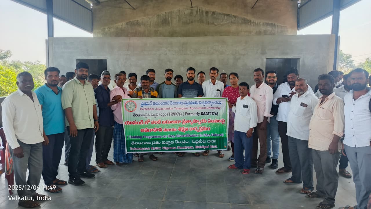 Telangana Rythu Vigyan Kendra (TRVK), Siddipet has organized training programme on crop diversification in rice fallows at Ankireddypalli (V), Kondapak (M), Siddipet (Dt) on 06.12.2025. Dr. Ch. Pallavi, Coordinator, TRVK Siddipet presented importance of crop diversification and also stressed more on zero tillage maize and sunflower in rice-fallows; after tillage green gram and black gram in rice-fallows and while green gram, blackgram, groundnut, sunflower, safflower, sesamum as irrigated dry crops. Also explained in detail the zero tillage practices to be fallowed in pulse and oilseed crops and varieties for rice fallow condition under Conservation agriculture practices including crop residue retention, zero tillage (ZT), and appropriate crop rotation show great potential for improving pulse yields in rice-fallow areas rather than paddy-paddy cropping system. In this programme, Sri. Shiva Rama Krishna (MAO) and AEO (G. Pranusha) and 56 farmers were participated.