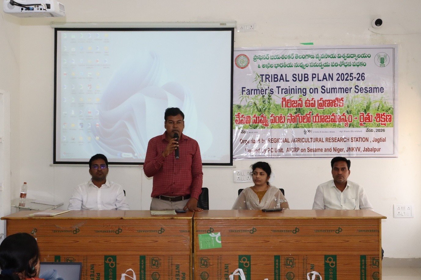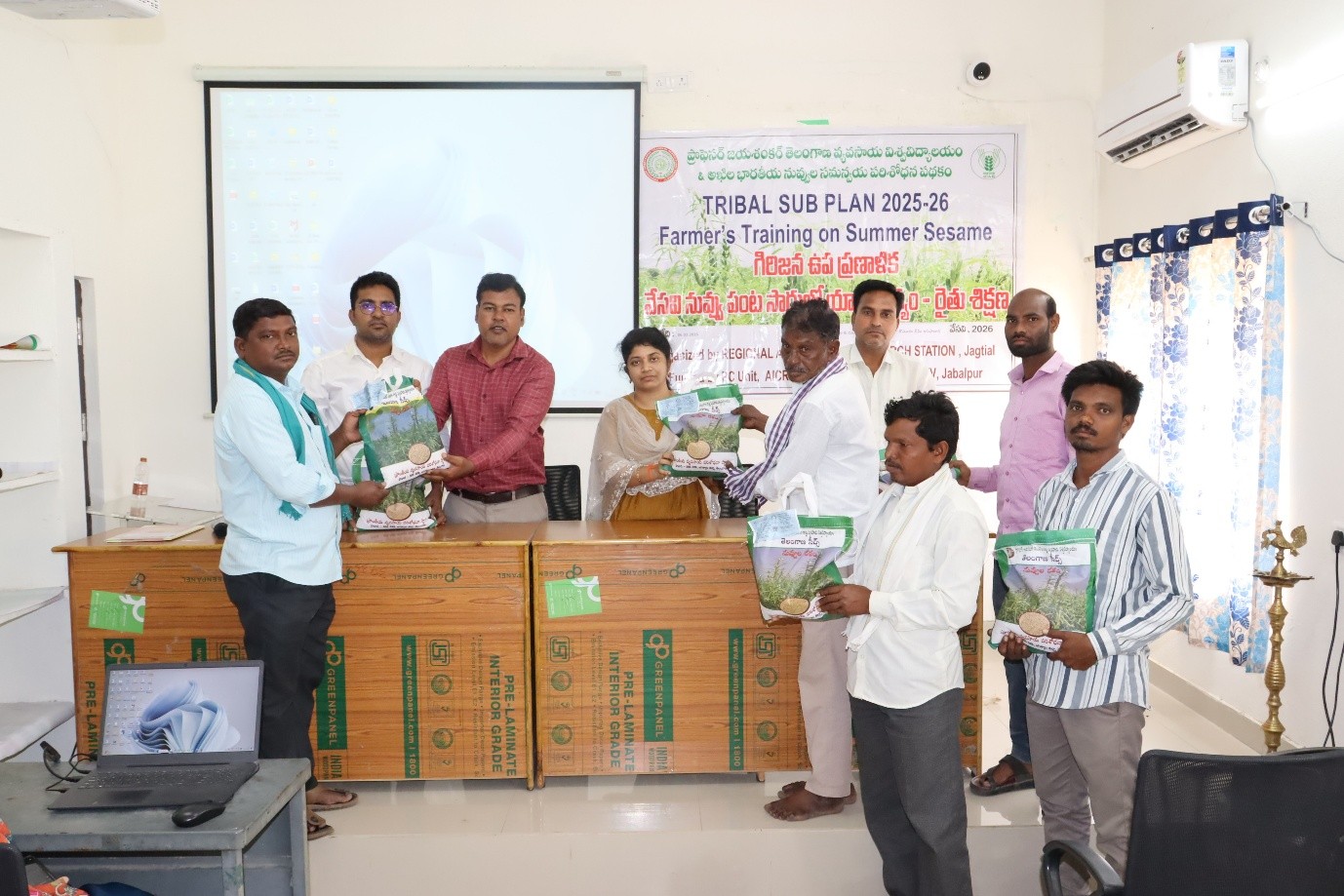 An Input Distribution-cum-Training Programme on Best Management Practices in Sesame was conducted under the Tribal Sub Plan (TSP) 2025–26 by AICRP on Sesame, Regional Agricultural Research Station (RARS), Jagtial organized at Krishi Vigyan Kendra (KVK), Bellampalli. During the programme, Dr. N. Sandya Kishore, Senior Scientist, AICRP on Sesame, explained the importance of sesame cultivation and highlighted improved production technologies, including suitable varieties, nutrient management, pest and disease management and yield enhancement practices. Dr. N. Mahesh, SMS (Crop Production) briefed the farmers on the importance of sesame in crop diversification and income generation, particularly for tribal farmers under rainfed conditions. As part of the programme, sesame seed (JCS-1020 and JCS-2454) distributed to 25 tribal farmers of Kerimeri Mandal, Kumuram Bheem Asifabad District to promote improved sesame cultivation practices and enhance productivity under the Tribal Sub Plan.
