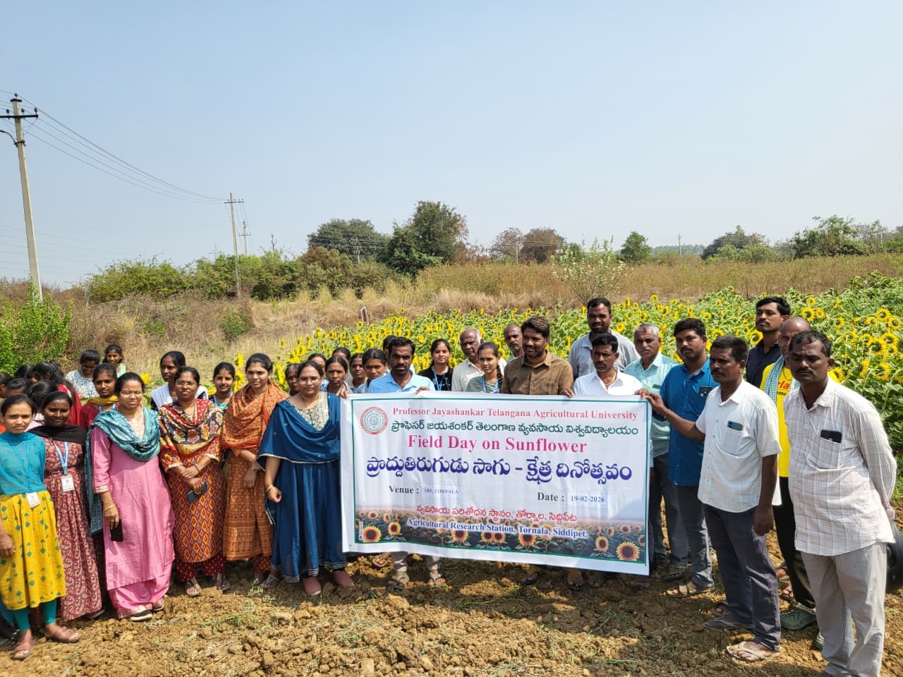A Training programme on “Production technologies of rabi sunflower along with “Field day on rabi Sunflower” was organized at ARS, Tornala on 19-02-2026 by Agricultural Research Station, Tornala. In this programme, Dr. G. Santhosh Kumar, Scientist (Agro.) and Head, ARS, Tornala highlighted on importance of alternate crops to rice during rabi season and their economic viability and importance of oilseeds in crop diversification. Dr. D. Swetha, Scientist (Agro), ARS, Tornala explained about characteristics of sunflower hybrid seed (Tillhan tech SUN H-1) such as duration 90-95 days, with yield potential of 9-11q/ac with oil content of 39-40%. She also enlightened farmers about importance of secondary and micro nutrients in sunflower production, production technologies in sunflower. Dr. A. Ramadevi, Scientist (Ento.), explained about pest and disease management in sunflower. Smt. G. Neelima, Scientist (Pl. Br), encouraged farmers regarding seed production, important aspects of seed production such as time and isolation distance maintenance in sunflower cultivation. Smt. A. Saritha, Scientist (Pl. Br) explained about paddy and pulses seed production Later, farmers have raised problems in cultivation of sunflower and scientists suggested solutions. Further, a field day was organised followed by inputs viz., borax, neem oil, corazen and reflective ribbon were distributed to the sunflower FLDs beneficiaries. The programme was attended by farmers of Mantoor and Anajipur villages.