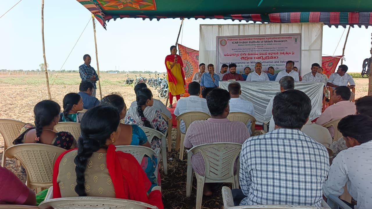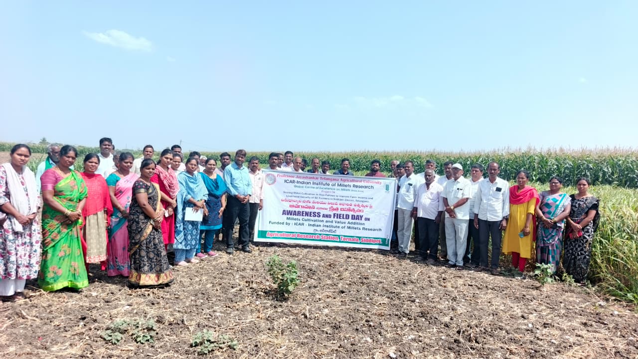 TRVK, Siddipet & ARS, Tornala conducted Awareness cum Field Day on Millet cultivation and value addition products was organized in the foxtail millet field of farmer Janardhan Reddy at Alirajpet village, Jagdevpur Mandal, Siddipet district on 07.04.2026. Dr. G. Santosh Kumar, Scientist and Head, ARS, Tornala, addressed the farmers. He stated that nearly 60% of the cultivated area in India depends on rainfed agriculture. Among these, about 75% is under coarse cereals, with crops like sorghum and pearl millet being widely cultivated. However, other millets such as finger millet, foxtail millet, little millet, kodo millet, barnyard millet, proso millet, and browntop millet are grown in relatively smaller areas. He emphasized that millets require less water, low investment, minimal inputs, and fewer chemical fertilizers. Therefore, they can be successfully cultivated in rainfed areas, shallow soils, and low-fertility lands without significant reduction in yields. He also mentioned that the government is promoting millet cultivation as they provide economic, food, and nutritional security, and encouraged farmers to adopt millet farming. Later, Dr. Ch. Pallavi, Coordinator & Scientist (CP), TRVK, Siddipet explained about the nutritional importance of millets and their value-added products. She explained that millets are rich in protein, fiber, vitamins, and minerals. They help improve heart health, control diabetes, and boost immunity. Additionally, millets contribute to soil fertility by fixing nitrogen and play a key role in enhancing food security and preventing malnutrition. She advised farmers to reduce the use of chemical fertilizers and promote millet cultivation. She also suggested that replacing crops like paddy and cotton with millets can result in higher profits with lower water usage and investment. Later, Dr. A. Ramadevi explained pest and disease management in various crops, Dr. D. Swetha highlighted the best management practices in millet cultivation. Smt. A. Saritha provided awareness on seed production techniques in different crops, Dr. G. Neelima informed farmers about the availability of seeds at ARS, Tornala. Farmer Kistaiah shared his experiences in millet cultivation with farmers. In this programme, A.D.A. Mr. Anil, MAO- U. Vasantha Rao, AEOs- Sharanya and Samatha, Alirajpet Sarpanch Yellesh, Itikyala Sarpanch Rajalingam, representatives from Coromandel Company (Prudhvi and Anil), Alirajpet FPO Chairman and members and 100 farmers were participated.
