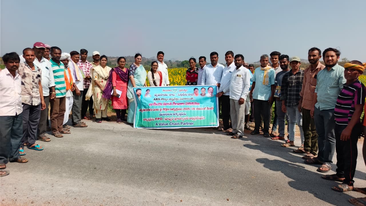 TRVK, Siddipet conducted Awareness and Training Programme on Improved Crop Management Practices in Sunflower at Katkur (V), Akkannapet (M) on 09.02.2026, Siddipet district. Dr. Ch. Pallavi, Scientist (CP) explained about improved cultivation techniques like timely sowing, nutrient management, and pest and disease control practices, micronutrient application, and reducing cultivation costs through need-based input use for achieving higher yields. Farmers were also informed about efficient input use and the role of micronutrients like boron in sunflower cultivation and placing 2-3 honeybee boxes can enhance yields by 10-15%. Later, Ms. Veena Reddy, ADA (Husnabad), informed the farmers that area should be increased under oil seeds which is main motto of NMEO project, further procuring, cold storage and post-harvest oil processing can be established if enough area will be under sunflower through FPO. Later farmers has raised various questions which were clarified by Scientist & Agriculture department staff. In this programme, Talseema Sulthana (MAO) and AEO (Ishwarya, Sabiha), ATMA committee chairman Jangapally Ilaiah, Katkur Sarpanch Balaraju and 50 farmers were participated.
