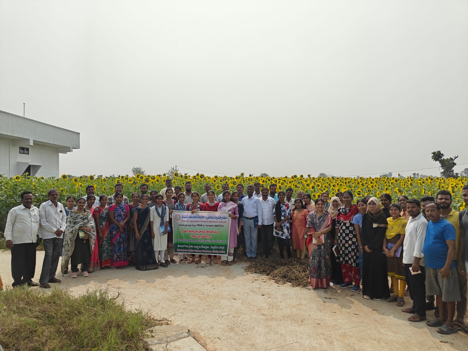 Telangana Rythu Vigyan Kendra (TRVK), Siddipet has organized training programme on Weather based crop management for Rabi season at Bachayapally (V), Siddipet Rural (M), Siddipet (Dt) on 02.02.2026. Dr. S. G. Mahadevappa, Principal Scientist, ACRC, Hyderabad explained about Weather based crop management for Rabi season. Paddy, maize, and sunflower should be sown at the right time, crop damage due to high temperatures and hailstorms during Yāsangi can be avoided, leading to higher yields. He also mentioned that the incidence of pests and diseases would be reduced, thereby decreasing the use of chemical pesticides. He informed the farmers that details about weather changes, five-day weather forecasts, and improved crop management practices are available in the form of bulletins. He advised farmers to use the Meghdoot and Damini mobile applications to get timely updates on weather conditions. Later, Dr. Ch. Pallavi, Coordinator, TRVK Siddipet explained that cultivating alternative crops to paddy such as maize, sunflower, green gram, black gram, sesame, vegetables, and safflower would promote and help in effectively controlling the stem borer pest, which is a major problem. She crop diversification further stated that these crops require less water, have a shorter duration, involve lower investment, and provide higher yields. Later, Ms. Padma, ADA from the Department of Agriculture, informed the farmers that from today onwards, urea booking must be done only through the mobile application, and she explained how to use the app. Later, Method demonstration of Borax in sunflower at button stage with Drone was done involving farmers and RAWEP students. In this programme, Sri. Naresh (MAO) and AEO (Sumithra), Sarpanch Premalatha, Upa sarpanch Aruna and 100 farmers were participated.