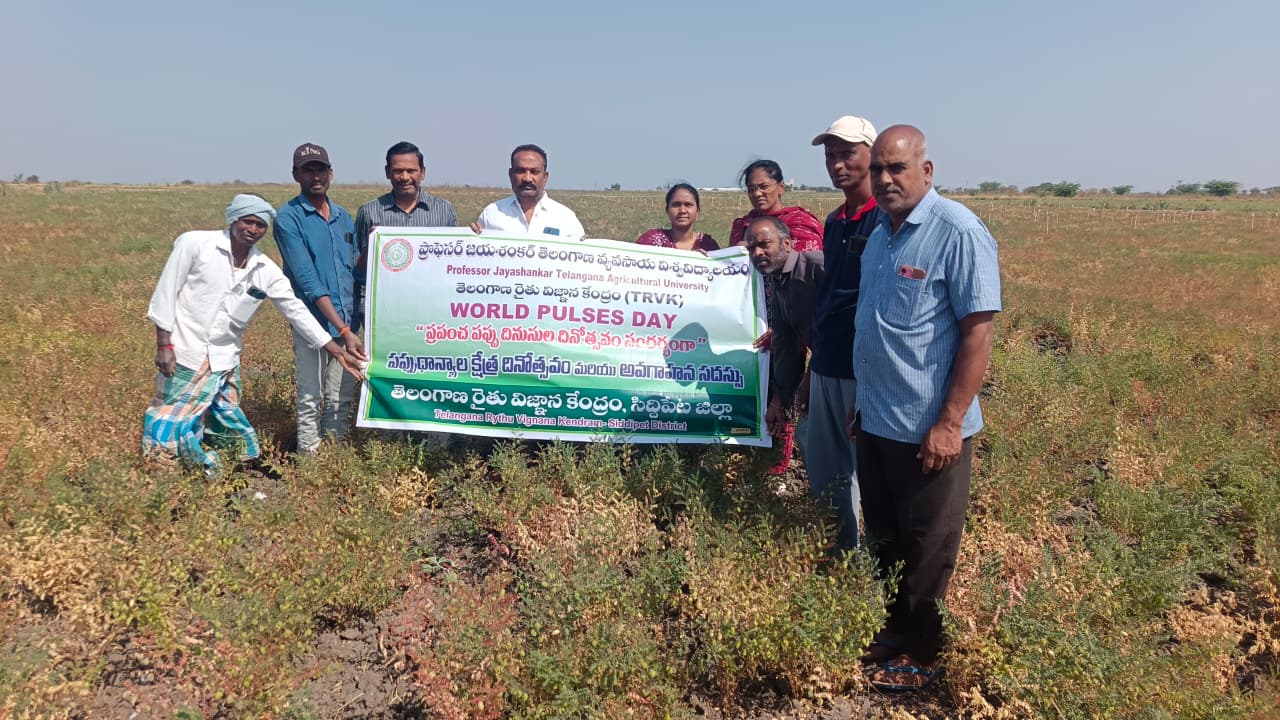TRVK, Siddipet organized World Pulses Day on 10.02.2026 at Alirajpet village, Jagdevpur Mandal, Siddipet district. The theme for this year’s World Pulses Day was “Pulses of the World: From Modesty to Excellence”. Dr. Ch. Pallavi, Coordinator & Scientist (CP), has explained the importance of pulses in providing essential nutrients for human health. She said that World Pulses Day is celebrated every year on February 10th to highlight the value of pulses. Pulses are rich in protein, fiber, vitamins, and minerals. They support heart health, help regulate blood sugar, and improve immunity. She also stated that pulse cultivation requires low investment and provides better profits. Pulses fix nitrogen in the soil, improve soil fertility, strengthen food security, and help prevent malnutrition. Farmers are earning higher income by cultivating crops like red gram, black gram, and green gram. She advised farmers to reduce the use of chemical fertilizers and promote pulse cultivation. By growing pulses as alternative or intercrops instead of paddy and cotton, farmers can get higher returns with less water and lower investment. Later conducted Field day on New Bengal gram variety NBeG-776 for selective mechanization at Rajamallu Kistaiah farmers field. NBeG-776 is an erect-growing variety with pods borne above the ground, making it suitable for machine harvesting. It is tolerant to dry root rot and can yield about 8–10 quintals per acre with bold seed size. Later Mandal Agriculture Officer, Sri. U. Vasantha Rao has also suggested the other farmers to take the seed from farmers and grow in next season as the variety is excellent and suitable for harvesting with combined harvester. In this Programme AEO- Ms. Sharanya, Alirajpet Sarpanch Yellesh and 20 farmers were participated.