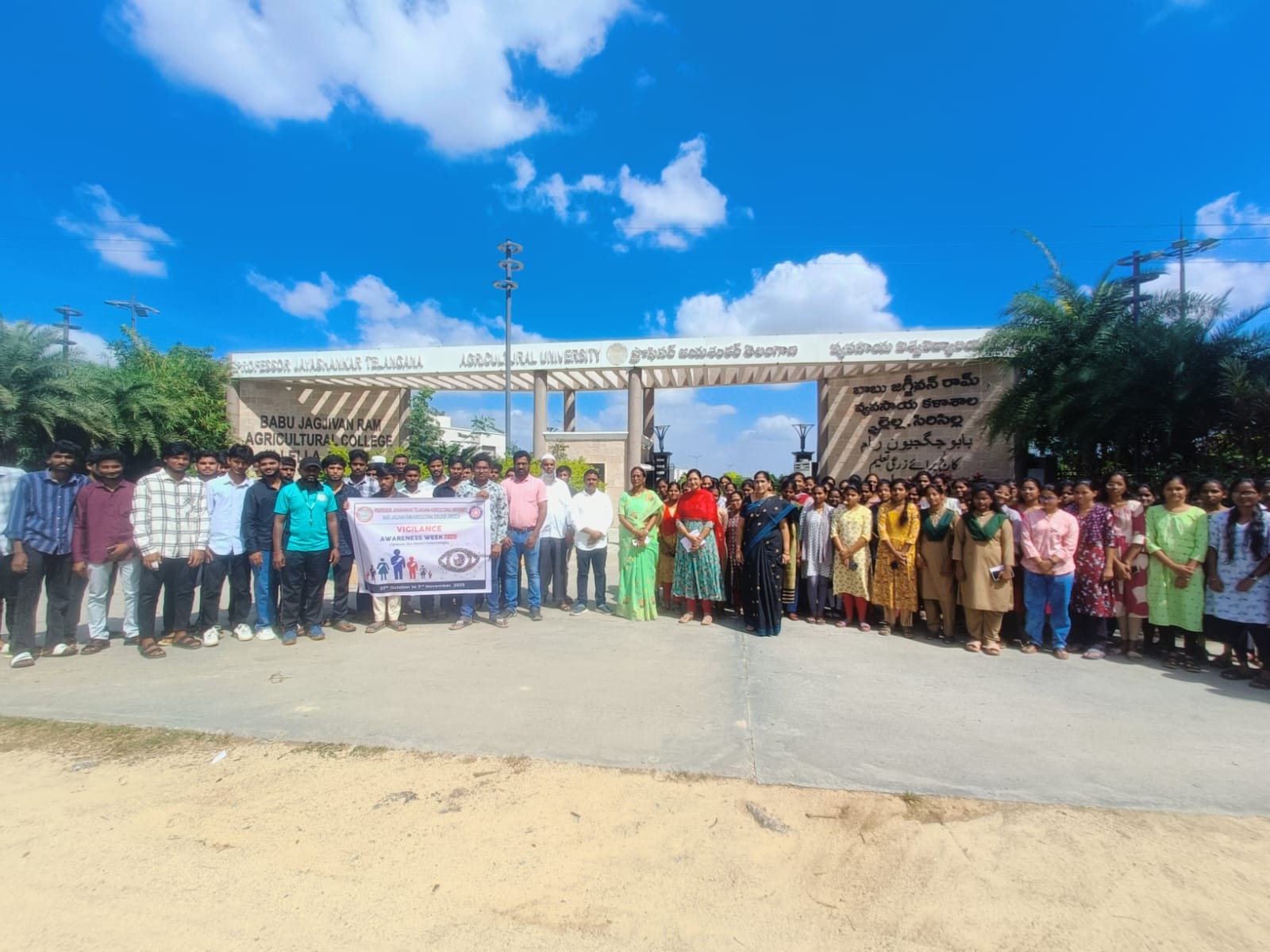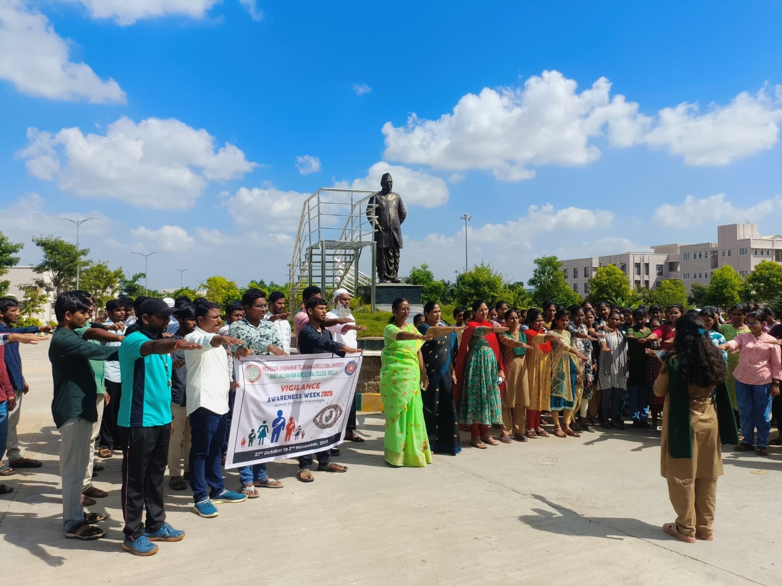 As part of Vigilance Awareness Week, 2025 from 27th October, 2025 to 2nd November, 2025, the NSS Unit of the college organized an awareness programme on 31st October, 2025 with the theme of "Vigilance: Our Shared Responsibility" to promote transparency, integrity and anti-corruption values among students. The programme commenced with the NSS Programme Officer, Dr. R. Sai Kumar, briefing the students about the significance of vigilance, ethical conduct and the need to build a corruption-free society. The Associate Dean, Dr. K. B. Suneetha Devi further enlightened students on the theme of Vigilance Awareness Week and emphasized the importance of honesty, accountability and responsibility in public life. After the address, the Associate Dean, staff and students took the Vigilance Pledge, reaffirming their commitment to uphold integrity and work collectively towards eradicating corruption. The event successfully created awareness on moral values, transparency and the role of youth in building a corruption-free India.