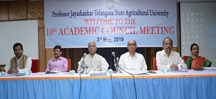 The 10th Academic Council Meeting of the Professor Jayashanakar Telangana State Agricultural University (PJTSAU) was held on 03-05-2019 at the Conference Hall in University Auditorium, Rajendranagar. The Vice Chancellor of PJTSAU Dr. V. Praveen Rao has chaired the academic council meeting, Registrar Dr. S. Sudheer Kumar and Deans of various faculties and several internal and external members of Academic council were attended and participated in the deliberations held on academic and administrative issues concerned to the university and passed the resolutions. The academic council has passed the resolution for proposed to enhance the 100 B.Sc (Hons.) Agriculture course seats from 563 to 663 (which include all categories) seats under payment and NRI sponsored quota. In which 75 seats will be filled under payment quota and remaining 25 seats will be filled under NRI sponsored quota. The payments seats will be filled as per the government norms and based on the merit secured in the Telangana EAMCET. Dr V. Praveen Rao, VC, PJTSAU has said that, the seats under payment and NRI quota will be filled after getting the final approval from the State government. In view of the growing demand for B.Sc (Hons.) Agriculture course seats, the university has proposed to increase the seats under NRI sponsored and Payment quota added the VC. The Academic council has also gave the approval for the reintroduction of PG programme in Statistics & Mathematics at the College of Agriculture, Rajendranagar, and also gave the approval for the reduction of seats in Agriculture Polytechnic course which is offering in university polytechnics from 330 to 220 seats. The other resolutions of academic council are as follows. The faculty of Home science name has changed to Community Science, the University Library name has changed to Knowledge Management Center, B.Sc (Hons.) community course seats were increased to 75 from 59 seats for the academic year 2019-20, the New Gold Medal sponsored in the name of " Professor Mohammed Taskeen AliNiaze Gold medal" by their Children who settled in US, which will be awarded to the student who secure Highest O.G.P.A in the M.Sc Agriculture course.Deans of various faculties Dr. J. Sathyanarayana, Dr. V. Vijayalaxmi, Dr. K. Sadasivarao, Dr. D. Vishnu Vardhan reddy were attended the meeting.