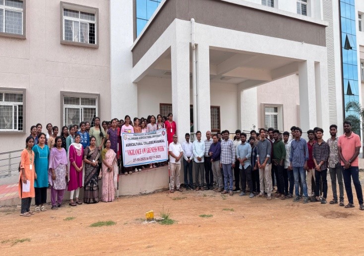 As part of Vigilance Awareness Week 2025, the NSS Unit of Agricultural College, Warangal administered the Integrity Pledge under the guidance of NSS Programme Officers Dr. B. Raju, Assistant Professor (SSAC), and Smt. K. Gopika, Assistant Professor (Plant Pathology) to promote the values of honesty, integrity, and transparency among the college community. A total of 110 NSS volunteers and 16 staff members (teaching and non-teaching) actively participated in the programme. The Associate Dean, Dr. V. Ravinder Naik, all the teaching and non-teaching faculty, actively participated in the pledge, and inspired all participants to uphold ethical values, integrity, and contribute towards building a corruption-free society. The programme successfully reinforced the spirit of collective responsibility and vigilance among the students and staff, aligning with the national objective of fostering transparency and accountability.