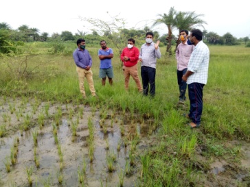 KVK Bellampalli Mancherial conducted Diagnostic field visit and visited minikit fields: RNR 21278, WGL 962 and WGL 1119 on 01.10.2020 along with Department of Agriculture Mancherial to the villages of Jaipur mandal, Bheemaram mandal and Nennel mandal. Dr. M. Rajeshwar Naik, Senior Scientist and Head and Programme Coordinator of KVK, Bellampalli, Mancherial interacted with the effected rice field farmers. During the visit, the following pest and disease in Paddy were observed and recommended accordingly as detailed below: Brown Plant Hopper is observed. To control, spray Buprofezin @1.6 ml or Dinotefuron @ 0.4 gr or Trifuzomyzam @0.49 ml or pymetrozone @ 0.6 g per litre of water is recommended; Bacterial Leaf Blight early stage infestation is observed. To control, spray recommended was Copper oxychloride @3 g + Plantomycin @ 0.2 g per liter of water; Slight incidence of hispa infestation is noticed. Recommended to spray profenophos@ 2ml or Chloropyriphos @ 2.5 ml per liter of water; In some fields, Stem borer is observed. Recommended carbofuron 3 G @ 10 kg per acre.Further, he added that, store the minikit seeds for seed purpose for the next seasons based on the performance and characteristics like crop duration, yield characteristics, pest and disease resistance. Afterwards, Dr. Shivakrishna Kota, SMS (Extension), noted the characteristics and opinion of the farmers about the minikits (Number of tillers). Farmers expressed their happiness with the growth and high number of tillers. Later, Dr. Vinod Kumar, DAO, Mancherial, Sri J. Bapu, ADA, Chennur, Sri. Mark Gladston, MAO and AEOs interacted with the farmers and enquired about the performance of the minikits. During this visit, 3 number of Minikit farmers along with village farmers of Burugupalli, Bheemaram mandal visited the Minikit fields and expressed their satisfaction on the good performance of the Minkits in terms of more number of tillers.