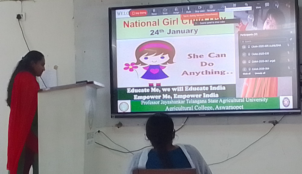 As per the instruction received from Dean of Student Affairs, PJTSAU, Agricultural College, Aswaraopet conducted “National Girl Child Day” on 24th January, 2022 through virtual mode. The day celebrated with an aim to provide support and opportunities to girls around the country, to create awareness about the importance of female education, health and nutrition, to promote awareness about the rights of the girl child and to spread awareness among the public about inequities faced by girls in the society. Associate Incharge, Dr. I.V. Srinivas Reddy has enlighten the students about National Girl Child Day. He said that every year National Girl Child Day is celebrated on 24th January, it is an initiative of Ministry of Women and Child Development started during 2008. He has mentioned that girl child is important asset for the world. Providing proper education facilitates to the girls creates knowledge, builds confidence, and breaks down barriers to opportunity. empowerment. Later Dr. K. Gopala Krishanamurthy, Associate Professor, Dept. of GPBR has added about the rights include nondiscrimination, the right to survival and development of potential, protection from harmful influences, abuses and exploitation, full participation in family, cultural and social life. Further, Dr. V. Venkanna, Associate Professor, Dept. of GPBR has explained clearly about the scheme “Beti Bachao - Beti Padhao” and women welfare schemes initiated by central government towards girl child education, scholarships, etc. Then, Smt. K. Naganjali, Assistant Professor, Dept. of Agronomy said that success stories of various women CEO’s of our countries to encourage girl students. Later, Dr. K.Shireesha mentioned her own story to motivate the girl students. Finally, NSS P.O Smt. D. Sravanthi mentioned that “save the girl child, educate the girl child” is a campaign of the Government of India that aims to generate awareness and improve the efficiency of welfare services intended for girls in India. All the teaching, non-teaching faculty and students participated in programme actively. NSS PO’s Dr. Ramprasad, Dr. Ramesh and Smt. D.Sravanthi were conducted the programme through Cisco Webex.