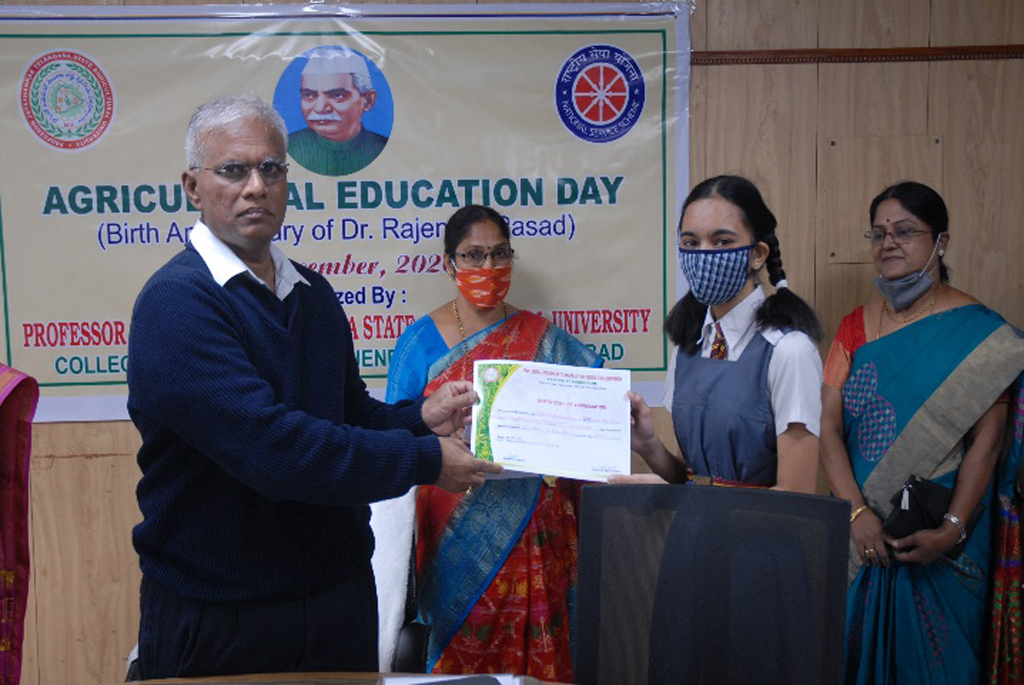 Indian Council of Agricultural Research has designated 3rd December as “Agricultural Education Day” to commemorate the birth anniversary of first President of Independent India and Union Minister for Agriculture, ‘Bharat Ratna’ Dr. Rajendra Prasad. The objective of this day is to expose students including schools to various facets of agriculture and its relevance to country's development, inspire them and attract them towards agriculture field so that they develop interest in agriculture and allied subjects, choose professional career after their schooling in some of these courses, engage themselves in agriculture and related activities or become agripreneurs in future. On this occasion on 2nd December the college has organised online Elocution, Poster making and Singing competitions for school students. There was over whiling response from 150 school students from classes VI to X standard from various government and private schools located in the vicinity of Hyderabad have participated in the competition. The theme for Elocution competition was “Role of Agriculture in Economic Development” and for Poster making “Impact of global warming on agriculture” and for Singing “Folk Song Related to Agriculture”. The winners of the competition are