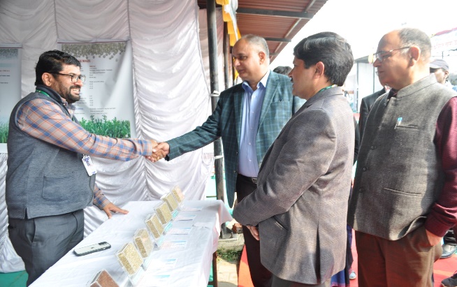 AICRP on Forage Crops & Utilization, ARI, PJTSAU, Rajendranagar, Hyderabad participated in Forage Technology Exhibition Cum Industry Meet-2024 held at Jhansi from 12.02.2024 to 13.02.2024. Keeping in view of doubling the farmers income in Agriculture and allied sectors, the Forage Crops & Utilization, ARI, PJTSAU, Rajendranagar scheme displayed the following forage varieties released and notified by PJTSAU, Hyderabad at national level exhibition. The high yielding forage varieties like Forage Maize (TSFM 15-5) is released over national check African tall which is the ruling variety for past 20 years with average green fodder yield potential of 445.0 q ha-1 and dry matter yield potential of 101.0 q ha-1; Forage Pearl Millet variety (TSFB 15-4) has high green fodder (427 q ha-1) and dry matter yield (84.7 q ha-1) potential and nutritious with high crude protein content (9.8%); Forage Pearl Millet variety (TSFB 15-8) released as single cut but also suitable for multicut with 1st cut at 50DAS, Subsequent cuts-30 days interval and also resistant to leaf spot and blight; Forage Pearl Millet variety (TSFB 17-7) released in the name of Telangana Fodder Bajra -1 which is Moderately resistant to leaf blast, downy mildew and resistant to leaf defoliators; Forage Pearl Millet (Multicut) TSFB 18-1 (Telangana Multicut Fodder Bajra-1) with High tillering ability; Forage multicut Motibajra (APFB 09-1) has green fodder yield potential of 81.1tons/ha in 3 cuts and Crude protein content is 9.6%. Hedge Lucerne variety (TSHL-1) which is Released for Central Zone and recommended for the States Maharashtra, Gujarat, Madhya Pradesh and Chhattisgarh with average green and dry fodder yield potential of 425 q/ha/yr and 92 q/ha/yr respectively and crude protein content is15.7%. Forage Cowpea Vijaya (APFC10-1) is short duration, Non-twiny, Suitable for Rainfed as well as Irrigated conditions and for intercropping. During the exhibition, Dr. M. Rajeshwar Naik, Principal Scientist (SSAC) explained in detailed about the varieties to the higher officials, stake holders and local farmers of Jhansi, UP. The above forage varieties of PJTSAU were appreciated by Dr. D.K. Yadav, ADG seeds, Dr. Praveen Malik, CEO, agln, New Delhi, Dr. A.K Singh V.C Central Agricultural University, Jhansi in presence of AICRP Project Coordinator Dr. V.K. Yadav.