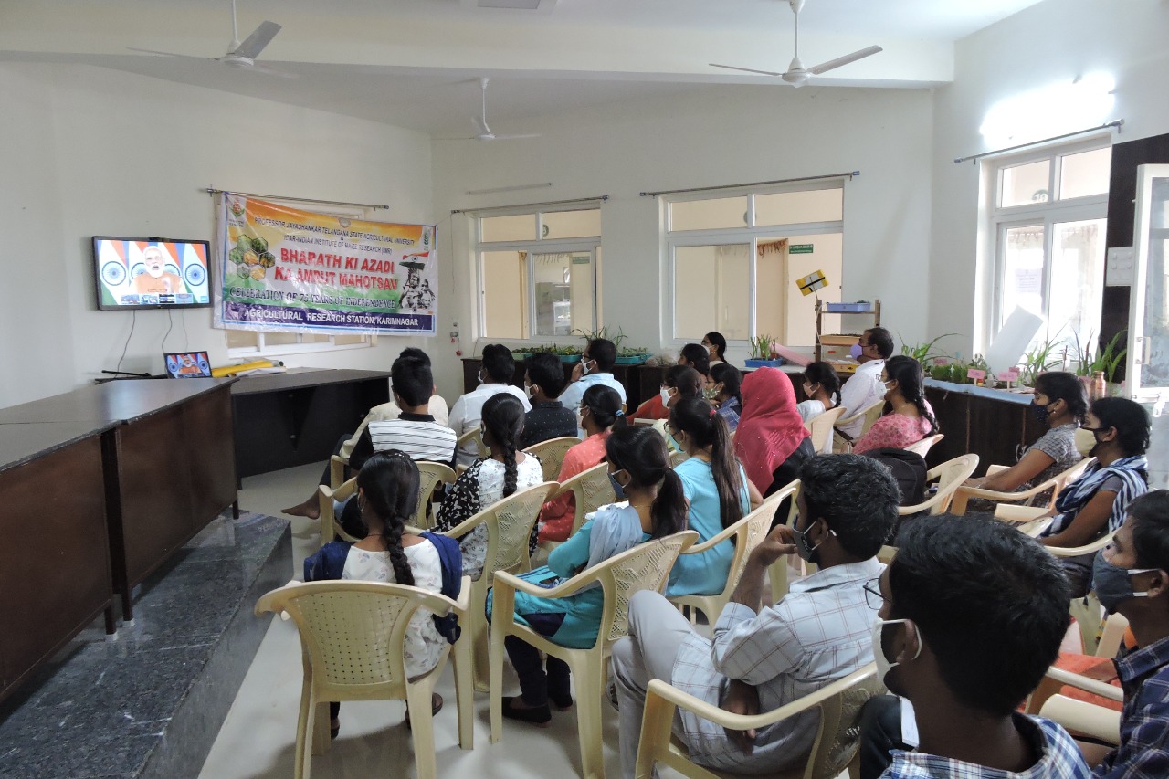 Agricultural Research Station and DAATTC Karimnagar participated in the Hon'ble Prime Minister Shri Narendra Modi Conference on "Natural Farming" on 16th December, 2021 as a part of Azadi ka Amrut Mahotsav. The link was also shared among several farmer groups and encouraged huge farmer’s participation in the conference. The scientists from ARS-DAATTC, Karimnagar constituting Dr.G.Manjulatha, Principal Scientist (Agro.) and Head, Dr.A.Vijay Bhaskar, Dr. E.Rajanikanth, Dr.G.Usharani, Dr.D.Sravani, Dr.K.Madan Mohan Reddy, around 10 farmers and 33 RAWEP Students of B.Sc.(Ag.) Final Year has participated in the programme. Later, the farmers and scientists had an interaction on crop diversification and encouraged the farmers towards adoption of natural farming in villages.