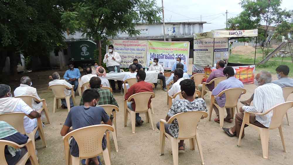 An awareness programme and field demonstrations were organized with a special focus on Dry Direct Seeding in Rice and High Density Planting in Cotton at Perkapally of Saidapur Mandal on 24thJune, 2021 by the Agricultural Research Station, Karimnagar. Dr. G.Usharani Scientist (Pl.Br.) and adopted village Incharge welcomed all the dignitaries and farmers. Sri.K.Shekar (Crop Production) & Coordinator, DAATTC, Karimnagar has explained the improved management practices to be followed under Dry Direct Seeding,Wet Direct Seeding of rice and the weed management practices under Direct Seeding of Rice and sensitized the farmers on importance of High density planting system in cotton for higher yields. The Dry Direct Seeding of rice was method demonstrated in Sri. P.Shankaraiah field with Jagtial Rice-1 variety in one acre. Later, the HDPS in cotton was method demonstrated in the field of Sri. Chintam Rajesh with the Sadanand hybrid of Bt cotton and explained to the participated farmers regarding reduction in the spacing, increase in the number plants/acre so that farmers will get the higher yields under canopy management practices. In this programme emphasis was given to the extension functionaries to explore the possibilities for popularization and promotion of the cost saving technologies among the farming community. The zonal representatives from Coromandel International Limited participated in the programme and explained about the latest products that could be useful for the farmers in the ensuing crop season. Around 50 farmers participated in the programme and interacted with the scientists regarding cultivation aspects of major crops cultivated in the village.