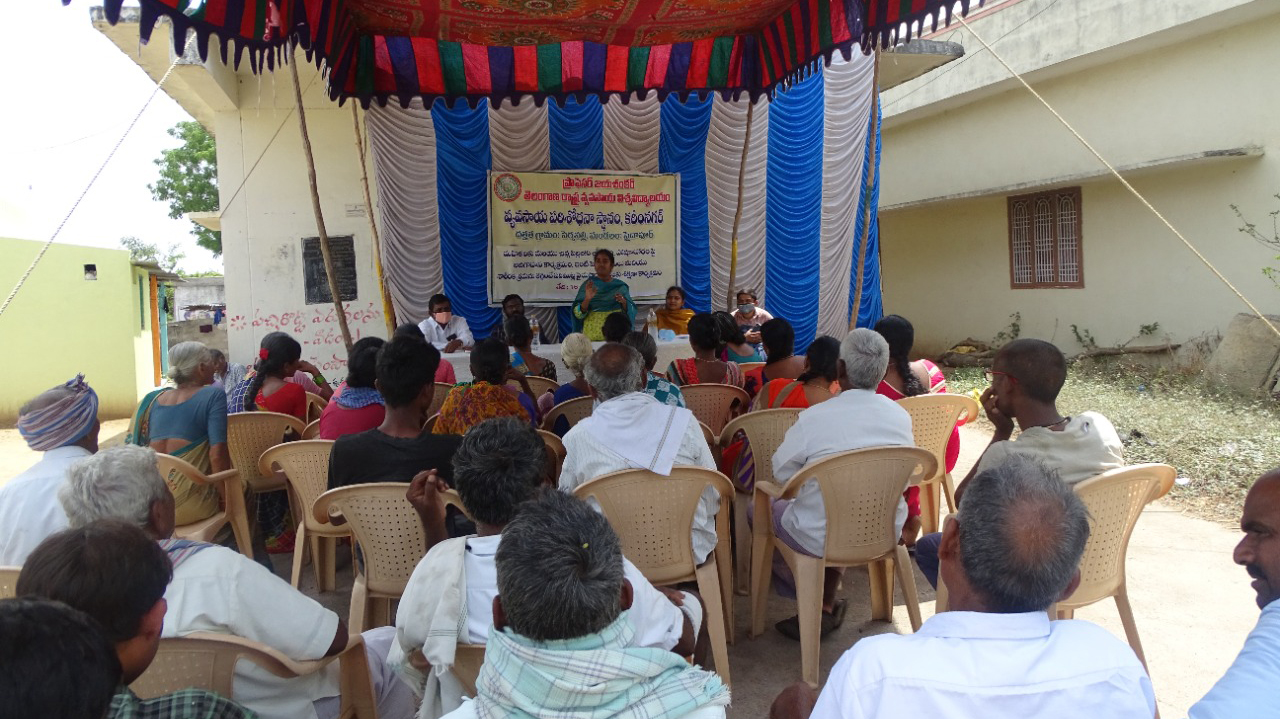 Awareness programme on Health and Nutrition among women and children at priority and training programme on Kitchen Gardening and Drudgery reducing implements for farm women was organized by Agricultural Research Station, Karimnagar at Adopted Village, Perkapally of Saidapur Mandal on 16th June, 2022. Dr. G.Usharani Scientist (Pl.Br.) and Adopted Village Incharge welcomed the dignitaries on to the dias and briefed the activities conducted in the adopted village. She sensitized the women to utilize the training programme as an opportunity to learn skills in kitchen gardening for growing all the required vegetables in their backyard which is the best way to consume fresh pesticide residue free fruits and vegetables as women and children malnourishment has been a persistent concern due to poor intake of fruits and vegetables. Krishi Vignan Kendra, Jammikunta Homescience, Scientist, Smt. A. Prashanthi, addressed the women farmers and provided awareness on health and nutrition among women and children and added that Malnutrition increases the susceptibility to infection and infection also contributes to malnutrition which is a vicious cycle. She focused on the probiotics, natural foods rather than cooked foods for consumption and age old practices of cooking for retention of nutrients to overcome the sudden infections due to microbes and to attain overall immunity. She also stressed upon the essence to maintain kitchen gardens in all the homes of the village to obtain foods and also to become self sufficient to meet the vegetable requirement of their families which are the immunity boosting foods during COVID situations and also help in inculcating healthy dietary habit in children. Various drudgery reducing implements for farm women like fertilizer applicator, easy planter, drum seeder, knitted gloves, chilli cutters, bhendi cutters, star weeders, etc. to overcome stress problems were delineated and the methods to obtain loans and repayment schedules for their purchase were also explained. Dr.M.Rajendra Prasad, Scientist, DAATTC, has enlightened the farmers to ensure seed treatment before sowing to reduce damage due to pest and disease attacks. The Sarpanch, Sri. Baththula Komaraiah, AEO, Sri. Vamshi, Coromandel firm staff, Sri. Prem and around 50 women farmers and 20 progressive farmers participated in the programme.