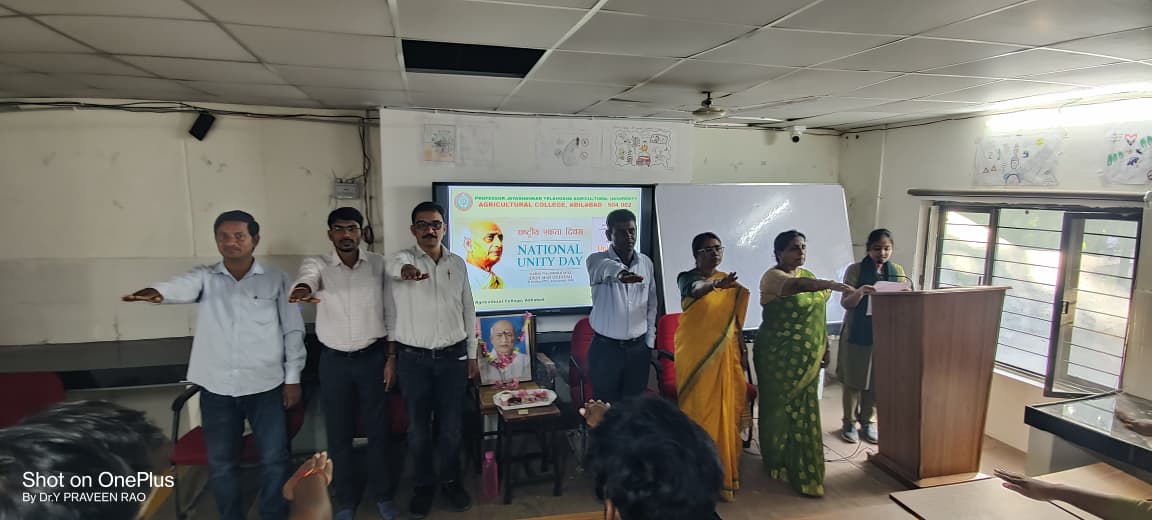 Agricultural College, Adilabad has celebrated birth anniversary of Sardar Vallabhbhai Patel on 31st October, 2025 on the occasion of the Rashtriya Ekta Diwas (National Unity Day). Dr. Y. Praveen Kumar, Associate Dean offered floral tributes to Sardar Vallabhai Patel and addressed the gathering on the importance of the day to ensure the safety, security, integrity, and unity of our country under all circumstances, expressed her views about Iron man of India stating that good relationship among the people of the nation is a binding force that brings peace and development and also enable us to unify against various threats of enemies. Later all the Teaching, Non teaching and students (around 50 nos.) paid floral tribute to Sardar Vallabhai Patel. All the faculty, Non teaching & supporting staff and Students took an ‘Rashtriya Ekta Diwas Pledge’ to preserve the unity, integrity and security of the nation in the spirit of unification of the county. College OISA Dr. G. Manjulatha gave the introduction about Sardar Vallabhai Patel and expressed his views about the importance of Rashtriya Ekta Diwas. She was emphasized that this year theme of National Unity day is ‘Unity in Diversity’ which emphasizes that the country strength lies in embracing its diverse culture, regions and beliefs.