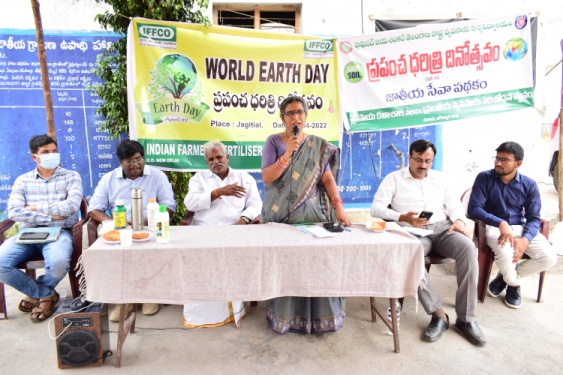 The programme was started by Dr. P. Ravi, Scientist (Soil Science) by inviting guests on to the dias and welcomed the farmers and officials for the programme. Chief Guest, Dr. M. Uma Devi, Associate Director of Research, RARS, Jagtial addressed the gathering and insisted about the importance of this day to create awareness about environmental issues like climate change, pollution, excessive use of plastic and indiscriminate use of chemicals in Agriculture which are affecting our planet Earth. Sri. Krupa Shakar Garu, State Marketing Manager, IFFCO explained about eco-friendly agricultural products of the company and also urged the farmers to follow balanced and needed fertilizer application based on soil testing. Dr. K. Chandra Shaker, Assistant Professor (Soil Science) explained importance of ‘World Earth Day-2022” with the theme Invest in our Planet with respect to agriculture. He advocated the farmers to increase organic carbon in their fields through raising of livestock and its role in improving the soil health which in turn reduces dependence on chemicals in farming and also improves the health of animals and human beings. Dr. G. Satyanarayana Reddy explained about ways and means to improve soil immunity through beneficial microorganisms, increasing organic carbon, crop diversification and crop rotation. Mr. Chandra Babu, District Marketing Manager, IFFCO explained about the bio-fertilizer and nano-urea products in improving of soil health for the benefit of farming community. Mr. Ganga Reddy Garu, Progressive farmer and Raithu Bandu Committee Member, spoken about the activities to be taken up to save our planet at village level. At the end Dr. G. Satyanarayana Reddy, Assistant Professor (Agronomy) gave reflections of the meeting and proposed vote of thanks. About 35 farmers from Gullapet Village, ELP and M.Sc. (Ag.) students from Agriculture College, Jagtial participated in this programme.