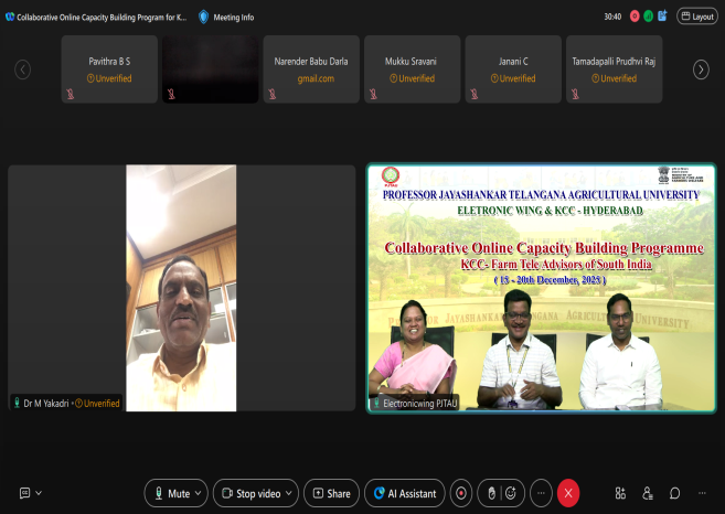 Electronic Wing, PJTAU and KCC, Hyderabad has jointly organized online training programme for Farm Tele Advisors of South India on “Capacity Building of FTAs” from 15th – 20th December, 2025. Chief guest of the Inaugural session Dr. M.Yakadri Director of Extension, PJTAU, Hyderabad in his introductory remarks stated that Farm Tele Advisors who act as the Frontline Extension workers can perform the role of Farmers Friends, through effective transfer of technology and it is of prime importance to update their knowledge on various burning farm issues and agricultural technologies, for effectively addressing the farmers queries. Dr. M. Balram, Director of Research, PJTAU attended the valedictory as chief guest, in his remarks stated that FTAs act as frontline warriors rescuing the farmers out of technical problems faced during the cultivation of crops by supporting them in right decision making. Various topics that were covered during the sessions were weed management in crops and cropping systems, advances in disease management technique, integrated pest management, market intelligence and price forecasting, seed production techniques and advances in micro irrigation. The Course organizing team constituted Dr. M. Sreenivasulu Course Director and Coordinator, Dr.J.S. Sudha Rani, Sr. Scientist (Agronomy) Course Director, Electronic Wing and Sri.Sanath Raj. Co-Course Director & KCC, Manager Hyderabad, Smt. Menak Sivam Co-Course Director KCC, Manager Coimbatore and Smt. Kusuma Co-Course Director KCC, Manager Bangalore, two batches of FTAs about 70 (35 participants in each batch from KCC) across South India attended the online training programme.