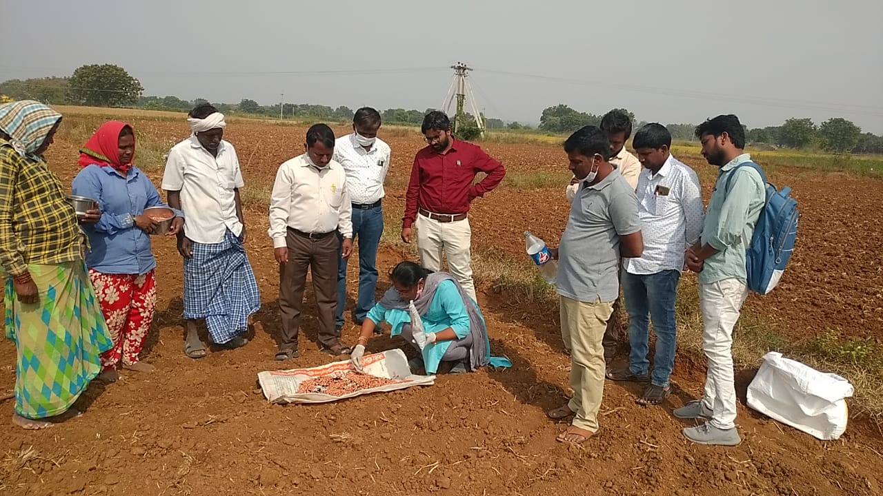 DAATTC, Tornala organized training programme on Pink bollworm management in Cotton on 10.11.02021 in Katkur village, Husnabad mandal, Siddipet district. During the programme, Sri J. Vijay explained about crop diversification in cotton fallows with green gram, blackgram and sesamum. As this area covers 1500 acres of sunflower, due to unavailability of seed they want to replace sunflower with jowar and we explained in detail about jowar crop management practices. He also explained about the groundnut cultivation in rice fallows followed by the method demonstration of seed treatment with 1 g Tebuconazole and 10 g of rhizobium culture per kg seed to the farmers in the field. Dr. Ch. Pallavi explained about the IPM practices and farmers were advised to install pheromone traps @ 4/acre in cotton for monitoring of pink bollworm. If each trap catch is more than 5-8 adult moths for three consecutive days, farmers were recommended to spray insecticides like Emamectin benzoate @ 0.5g/lit or Indoxacarb @ 1.0 ml/lit or Spinosad @ 0.4ml/lit or Spinetoram @ 0.9ml/lit. After that, interacted with farmers and clarified their doubts about pest and disease management and various crops to be grown in rice fallow as part of crop diversification and weed management under such situations. Assistant Director of Agriculture P. Mahesh, Mandal Agricultural Officer Nagaraju, AEO Ranjith, ATM Sai Charan, Sarpanch, RSS member and 42 farmers participated in the programme.