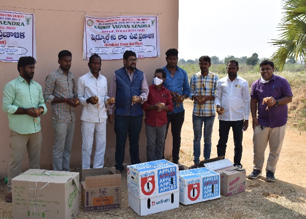 Krishi Vigyan Kendra, Bellampalli, Mancherial District distributed Backyard Poultry Birds, Rajasri (6 week old) to the tribal farmers and Scheduled caste farmers of both Mancherial & KB Asifabad districts under Tribal Sub Plan (TSP) and Scheduled Castes Sub Plan respectively on 11th January, 2021 at Instructional Farm of KVK, Bellampalli. Keeping in view of doubling the farmers income in Agriculture and Allied sectors, the adopted villages of KVK, Bellampalli under TSP and SCSP were selected with the concern of the respective village Sarpanches and with the Gram Panchayat Resolution viz., Manneguda of Nennel Mandal, Lambadithanda - K of Kasipet mandal, Perkapalli (L.T) of Bellampalli mandal, Elkeshwaram of Bheemaram mandal, Kistampet of Chennur mandal, Pulimadugu of Mandamarri mandal of Mancherial district and Pangidimadaram, Bheemgiguda and Geethanagar villages of Tiryani mandal of KB Asifabad district (Aspirational) under Tribal Sub Plan. In the same way, Malagurijala, Rangapet and Dugnepalli villages of Bellampalli mandal, Boyapalli village of Thandur mandal, Manneguda and Gundlasomaram villages of Nennel mandal of Mancherial district were selected under Scheduled Castes Sub Plan. Dr. M. Rajeshwar Naik, Programme Coordinator, KVK, Bellampalli addressed the tribal farmers and SC farmers on the main objective of distributing the backyard poultry birds/homestead poultry farming to rural families is to create a lucrative source of supplementary income by involving low investment, yields high economic returns and can be easily managed by women and children. In addition to this, the eggs and meat acts as a rich source of protein and energy for poor households. For this programme, Dr. Shivakrishna Kota, SMS (Agricultural Extension), Sri A. Nagaraju, SMS (Plant Protection), Dr. I. Thirupathi, SMS (Crop Production), Smt U. Sravanthi, SMS (Horticulture) and Sarpanches of respective villages and the 125 No. of beneficiary tribal farmers and 30 No. of scheduled castes farmers were attended.