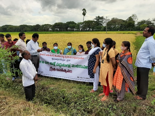 The advent of 21st century heralded the burgeoning of populations which is placing burden on increasing the production of paddy as it as the staple food for south Indians. Along with it, the scarcity of labour and amplified cost of cultivation is necessitating the need for introduction of technologies that are less dependent on labour and decrease the cost of cultivation. The rice transplanting is done manually by using seedlings of 20 to 30 days. The manual transplantation requires more man days per hectare and is labour intensive compared to 1 to 2 man days per hectare required in these methods. The dry converted method consists of sowing seed directly using seed drill or broadcasting in a well levelled field. The late onset of monsoon with erratic and untimely water supply delays rice transplanting. Further, the deficit monsoons, delayed and limited release of water from reservoirs is a major concern to farmers as they do not get sufficient water at right time and it is imperative for them to complete transplanting within a short time of water availability. The rice cultivators are increasingly facing water crisis in traditional rice cultivation along with challenges of increased labour cost. The transplanting of rice necessitates adequate land preparation both for nursery and main field with them consuming more water. It also requires 25 – 30 man days for manual establishment of the same and is dependent on soil type.These alarming situations of rainfall vagaries, delayed and limited release of water from canals has brought forth Krishi Vigyan Kendra, Wyra to assess the performance of dry converted wet rice cultivation as an alternative to traditional method of transplanting rice which could avoid the present-day situations to certain extent in reducing the cost of cultivation and also to avoid labour shortage.The onset of monsoon results in flooding of water bodies like canals, tanks, rivers, reservoirs with water and when water is abundantly available for paddy cultivation farmers convert it into flooded rice. This method has the advantage of saving time of around 45 to 60 days without any delay in paddy cultivation. In comparison to transplanted method, in dry converted wet rice method considerable amount of water can be saved and the crop matures 7-10 days earlier. The net returns increased approximately by 8000 to 10000 per acre and timely sowing of rabi crops can be taken up. In view of this, KVK, Wyra has organised field day on “Dry converted wet rice” in its field on 16.11.2021 for creating awareness and popularising the method. Along with dry converted wet rice and direct seeded rice, machine planting of rice was explained and fields shown to farmers. The meeting was participated by Mrs. K. Vijayanirmala, DAO, Khammam, Dr. J. Hemantha Kumar, Programme Coordinator along with scientists Dr. Jessie Suneetha W, Dr. V. Chaitanya, Dr. K. Ravi Kumar, Mrs. P. S. M. Phanisri and department officials. The progressive farmers at the forefront of this technology from Vemsoor and Wyra mandals shared their experience with farmers numbering 96 and they showed great interest in adopting the technology. The queries concerning the technology were clarified and also suggested alternate crops for Yasangi Rice by the Scientists of KVK and department officials.