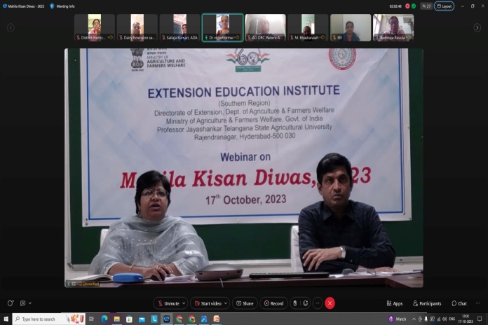 Extension Education Institute, Hyderabad celebrates National Mahila Kisan Diwas -2023 on October, 17 by organizing a webinar on Women as Change Agents to Steer the Rural Economy of the Nation: A Celebration of Mahila Kisan Diwas, 2023. The webinar had two lead sessions delivered by eminent professionals in the field of women, gender studies and entrepreneurship. During the inaugural of the webinar, the introductory remarks were given by Sri. Manish Bhatia, Director, Administration, Sri. S. M. Khalikar, Joint Director (Extension) and Dr. Punam Tiwari Sharma, Joint Director National Gender Resource Centre from Ministry of Agriculture and Farmers Welfare, Govt. of India. Addressing the audience Sri. Manish Bhatia stressed on the theme of International Mahila Kisan Diwas which was to bridge the existing digital gaps in women empowerment and to achieve the vision of the honorable Prime Minister of India to achieve Women led Development by 2047. Sri. S. M. Khalikar spoke about the laudable achievements of women in India and gave a clarion call to emulate them in taking the nation forward. Dr. Punam Tiwari Sharma spoke about Gender mainstreaming and women inclusive community development. Earlier, the webinar started with a welcome note by Dr. M. Preethi, Professor, EEI, while Dr. M. Jagan Mohan Reddy, Director, EEI gave a brief about the webinar. Dr. Padmaja Ravula, Principal Scientist, ICRISAT, Telangana was the first lead speaker who spoke on Cultivating Change – Bridging socio – Economic and Technological gaps for Women in Rural India. Dr. Ravula gave a land scape of gender gaps, triple burden of women in India, rural - urban gender disparities and millet journey of women. Her session was well appreciated by the audience and was followed by interesting interaction. Ms. MahaLakshmi Sarvanan, Founder -Women Entrepreneurs India was the second lead speaker of the webinar who spoke on Rural Entrepreneurship in India: Women as Catalysts of Change. Ms. Sarvanan spoke on Rural Entreprenuership, its challenges, need for addressing the technological challenge, gaps in storage facilities, value addition, marketing and the needs to address them. Her session had numbers of questions posed by the participants and a fruitful discussion followed. To conclude, Dr. M. Jagan Mohan Reddy gave a very analytical concluding remarks followed by vote of thanks proposed by Dr. m. Preethi. The webinar was attended by 75 officers from different sectors from all the client states and UTs of EEI, Hyderabad.