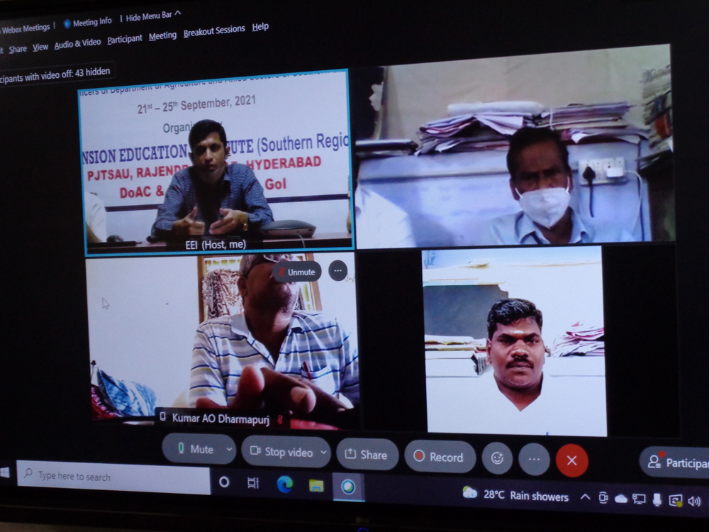 The valedictory programme of the online training programme on Waste management in Agriculture and Allied Sectors was conducted on 25.9.2021, which was started from 21st to 25th September, 2021at EEI, PJTSAU, Hyderabad. 56 participants from the states of Telangana, Andhra Pradesh, Tamilnadu, Karnataka, Kerala, Odisha and Andaman & Nicobar Islands representing Agriculture, Agricultural Marketing & Agri Business, Animal Husbandry, Sericulture, Fisheries KSSRDI and OCTDMS attended the programme. The programme was tailor made to the officers by incorporating sessions on Waste management in Agriculture and Allied Sectors – An overview, Composting from Agri Waste – Models and casestudies, Wealth from Waste, Role of Crop Residues in Organic Crop Production, Bio – Energy from Agriculture Waste and Soil Conditioner from Water Hyacinth, Waste Management for Organic Tomorrow, IFS – Resource Recycling, Waste Management in Sericulture, Waste Management in Fisheries Sector, Livestock Waste Management, Production of Bio Formulations using Agriculture Waste, Current Best Practices followed by GHMC in Solid Waste Management and Gender role in waste management. The valedictory programme was chaired by Dr. M. Jagan Mohan Reddy, Director, EEI Who in his address stressed the importance and need of the Waste management in agriculture and allied sectors and how to address the hazardous and non hazardous waste materials, innovative methods, various forms of waste disposable techniques. He urged the participants to translate the knowledge to our farming community. All the participants appreciated the content and methodology of the programme. They said that this is very important and need of the hour.The programme was coordinated by Dr. P. Vijaya Lakshmi, Professor and Dr. I. Sreenivasa Rao, Sr. Professor, EEI, Hyderabad.