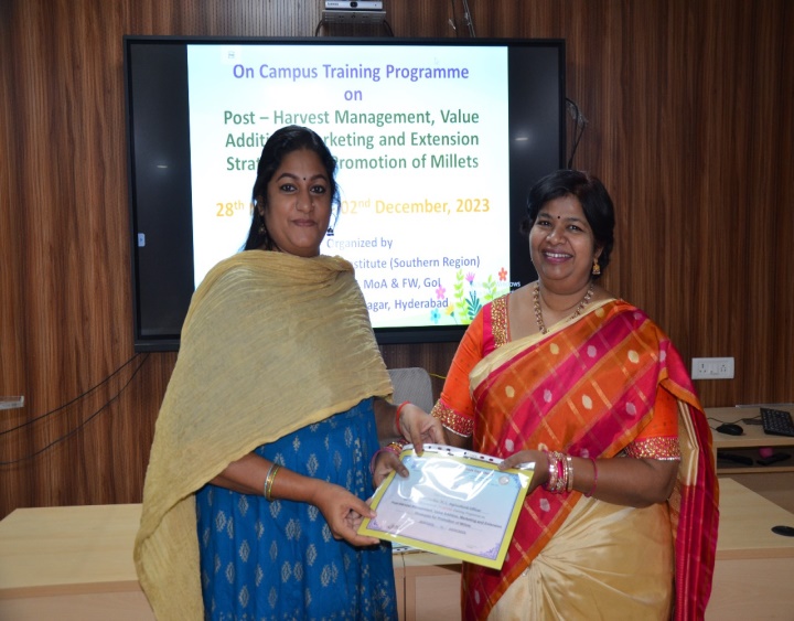 Post-Harvest Management, Value Addition Marketing, and Extension Strategies for Promotion of Millets are crucial for agricultural officers in India as they enhance their understanding of efficient harvesting, storage, and processing techniques, ensuring minimal post-harvest losses. Additionally, these programs empower officers with knowledge on value addition, enabling them to guide farmers in transforming millets into higher-value products for better market competitiveness. Moreover, extension strategies foster effective communication between officers and farmers, promoting the adoption of millet cultivation practices, which are vital for food security and diversification of agricultural production. Such trainings equip officers with the necessary tools to bolster the millet sector and contribute to sustainable agricultural development in the country. The On campus training programme was organized at EEI, Rajendranagar Hyderabad from 28th November to 02nd December, 2023. During the Ice breaking, Ice breaking was conducted to ease the participant’s initial hesitation. Telling names with a positive adjective that starts with the starting letter of their name and number game was administered as ice breaking exercises. Field visits organized International Nutricereals convention Centre (INCC) 5.0, Millet Processing and Incubation Centre, PJTSAU, S.S. Bhavani foods, Beeramguda, Hyderabad, Indian Institute of Millet Research. The Field visits were made to show case primary and secondary processing in millets, value addition to different millets and entrepreneurship opportunities in millet sector. During hands on training, the participants were exposed to different machinery used in primary and secondary processing of millets. During inauguration, Dr. M. Jagan Mohan Reddy, Director, EEI spoke about the need and importance of millets in reducing carbon foot print and in inclusion of millets in daily diets for a healthy living. A total of 13 participants from Dept. of Agriculture of Andhra Pradesh and Kerala. All the Participants expressed that all field visits have given them first-hand experience of primary and secondary processing of millets and value addition in millets. They felt that knowledge disseminated through different sessions will enable them to pass on millet related information to farmers as all the officers were given targets to expand the millet cultivation area in their respective jurisdiction. The programme was coordinated by Dr. M. Preethi, Professor, EEI, Hyderabad.